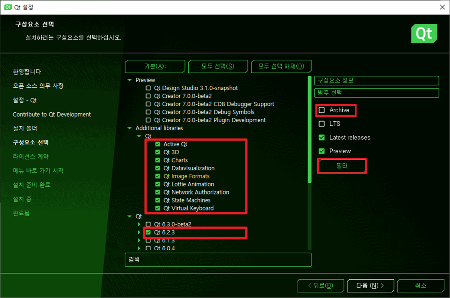 만약 Qt 6.2.3이 없다면 Archive를 체크하고, 필터를 클릭하면 전체 버전의 Qt가 리스트에 나타납니다. 해당 버전을 체크하여 계속 진행하면 됩니다.