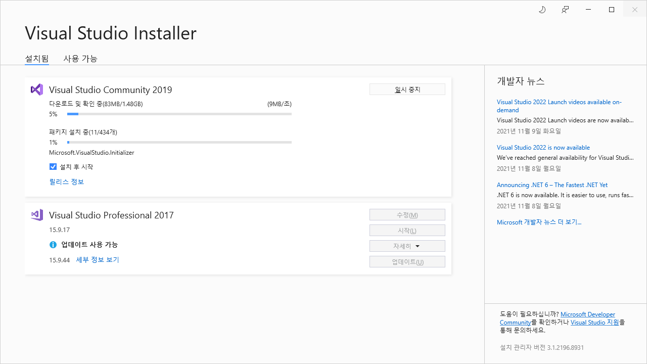 압축을 풀어 vs_community.exe를 실행하면 다음과 같이 화면에 나타납니다.