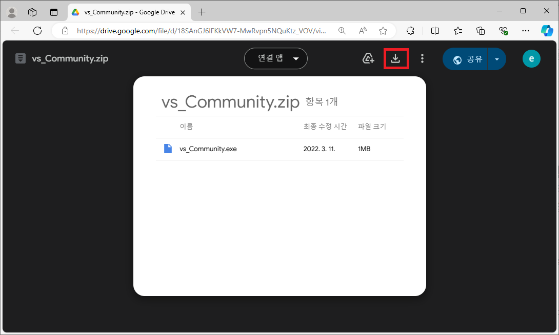 우측상단의 다운로드 버튼을 클릭하면 vs_community.zip 파일이 다운로드 됩니다.