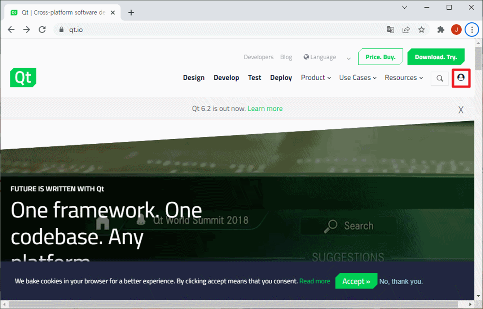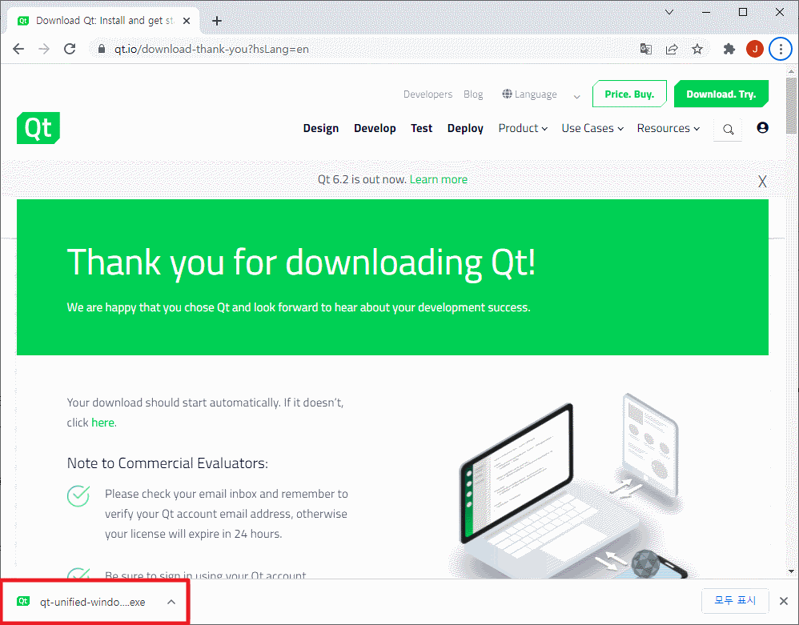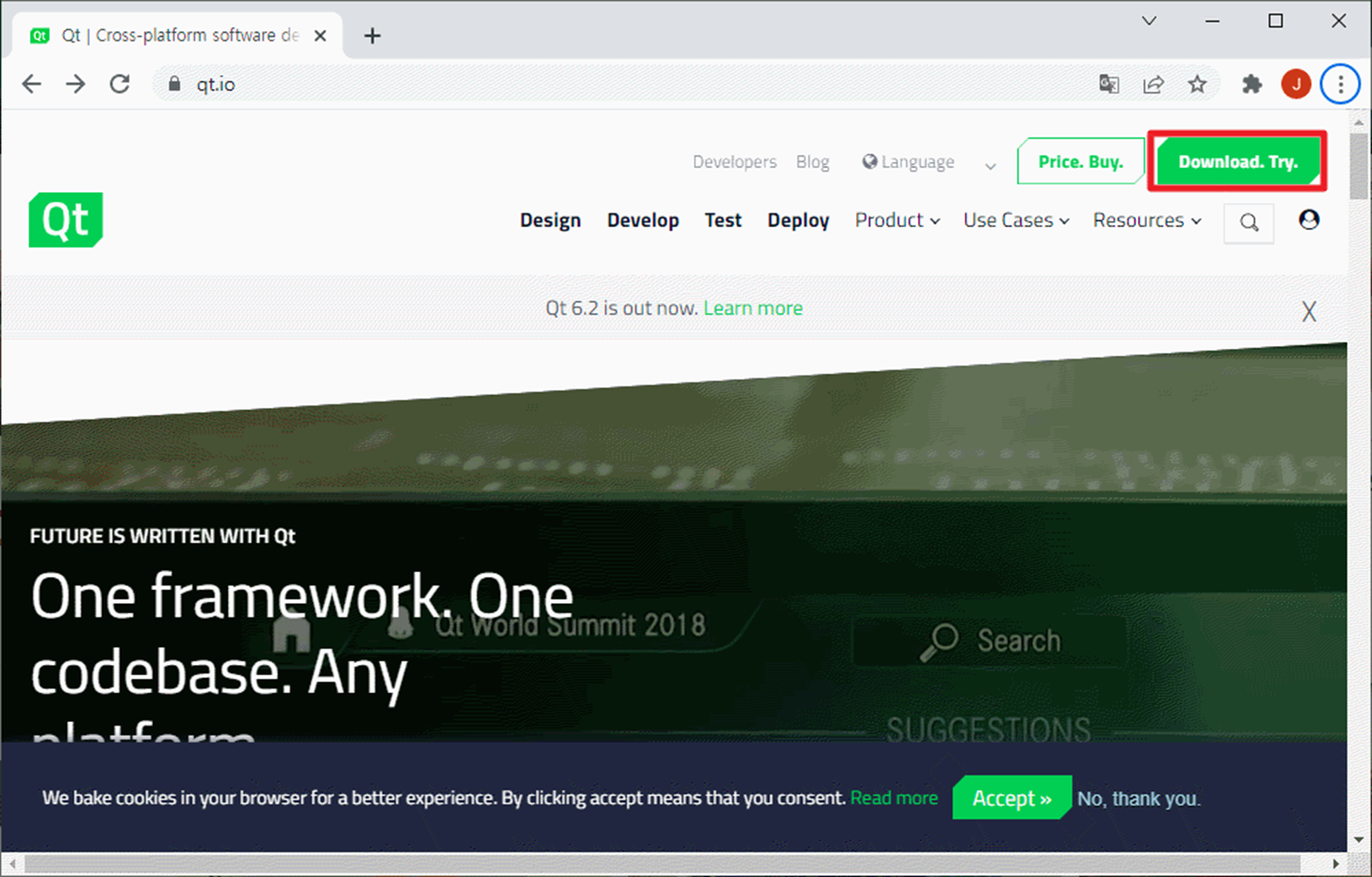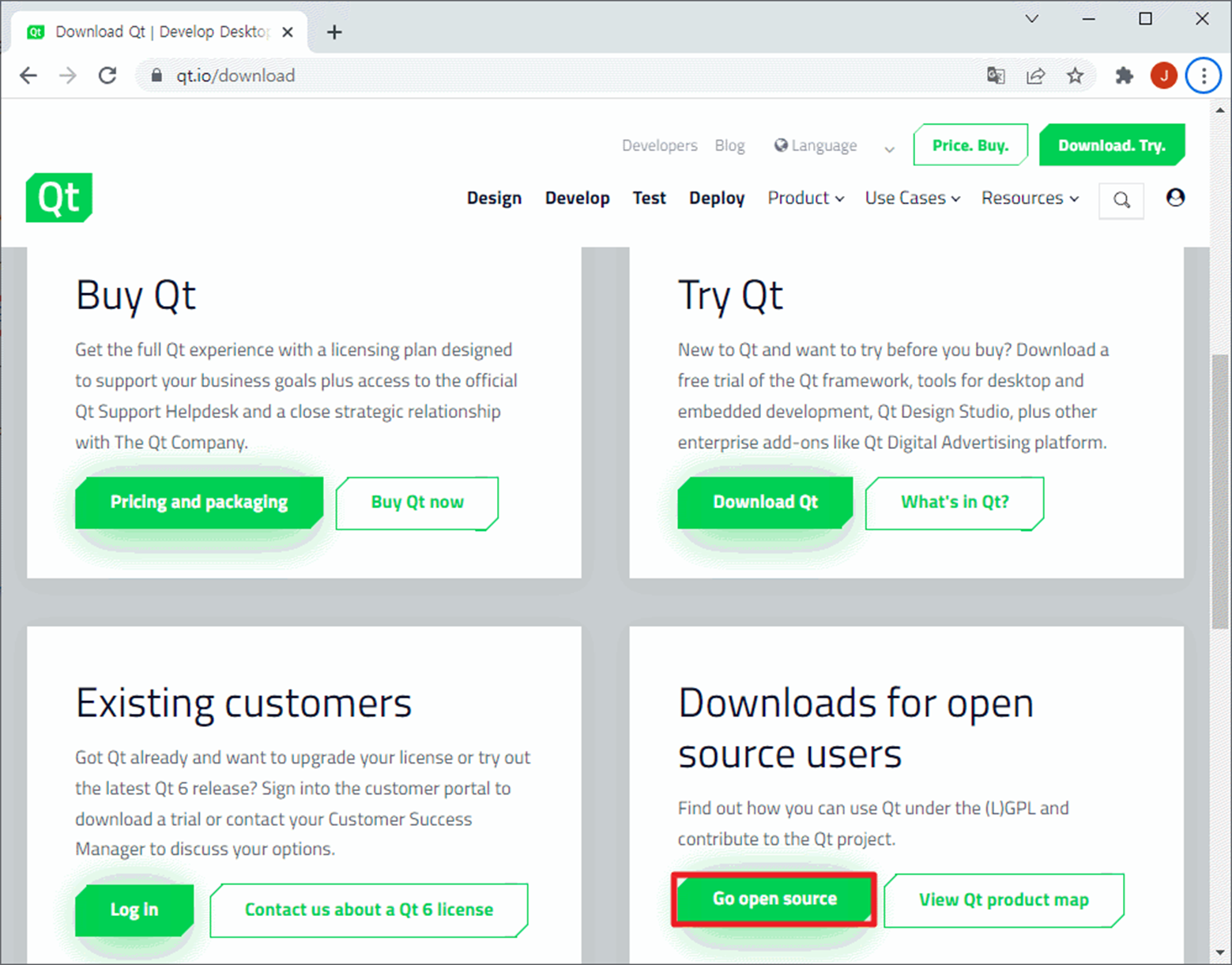 Web browser를 실행하여 주소표시줄에 qt.io를 입력하면 다음과 같이 화면에 나타납니다.