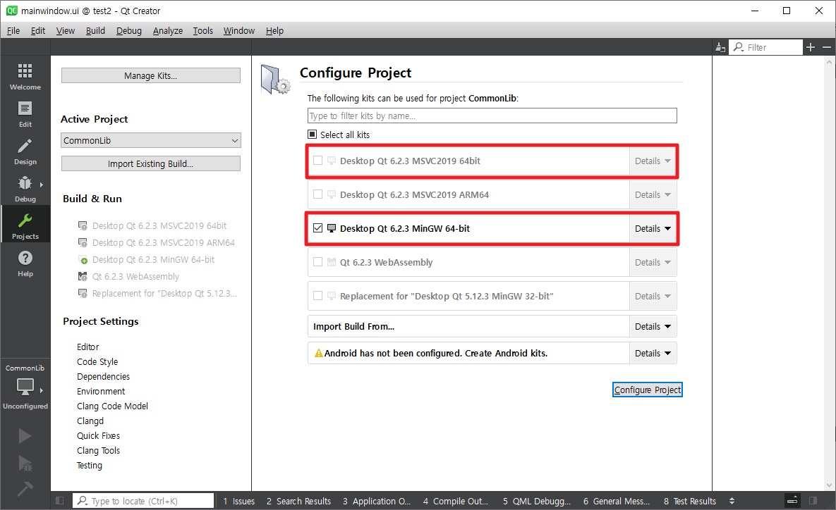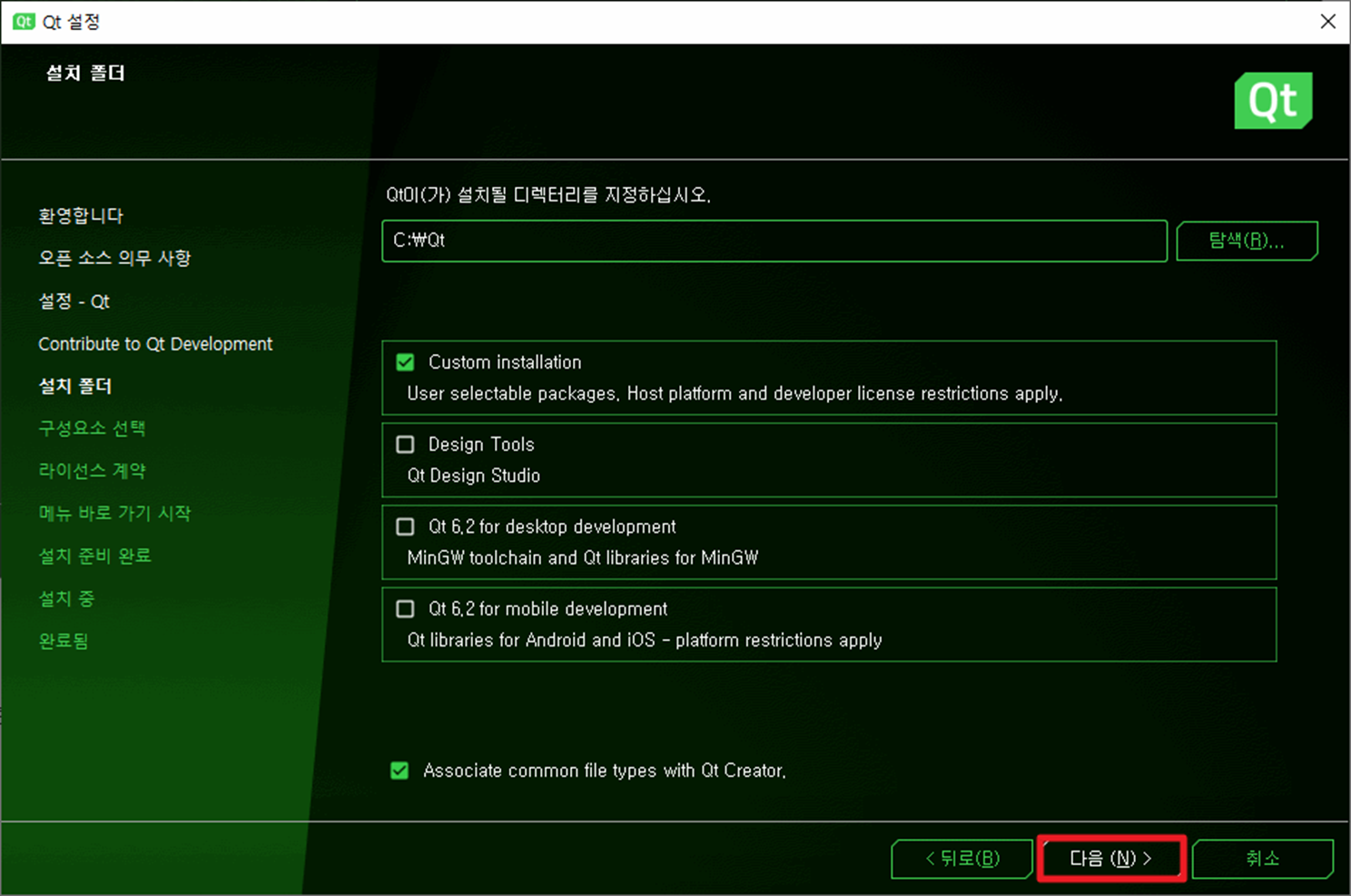 QT만 설치하여 사용할 수 있는 Desktop Qt 6.2.3 MinGW 64-bit와 Visual studio를 설치하면 사용할 수 있는 Desktop Qt 6.2.3 MSVC2019 64bit입니다.