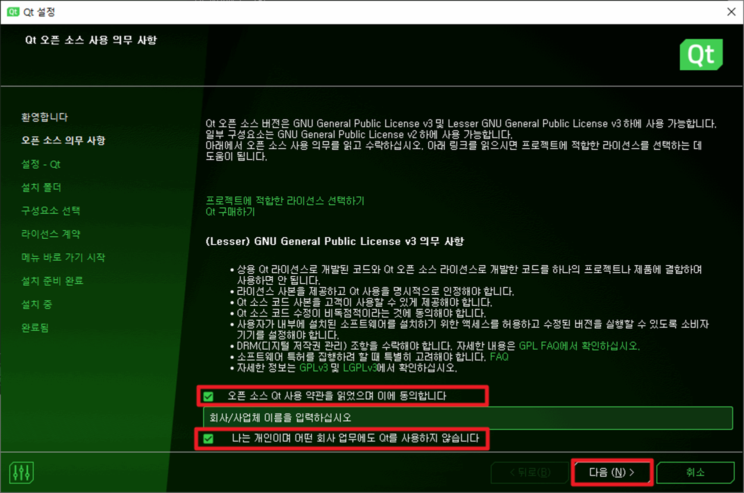 두 개의 체크버튼을 체크하고 다음을 클릭하면 다음과 같이 화면이 나타납니다.
