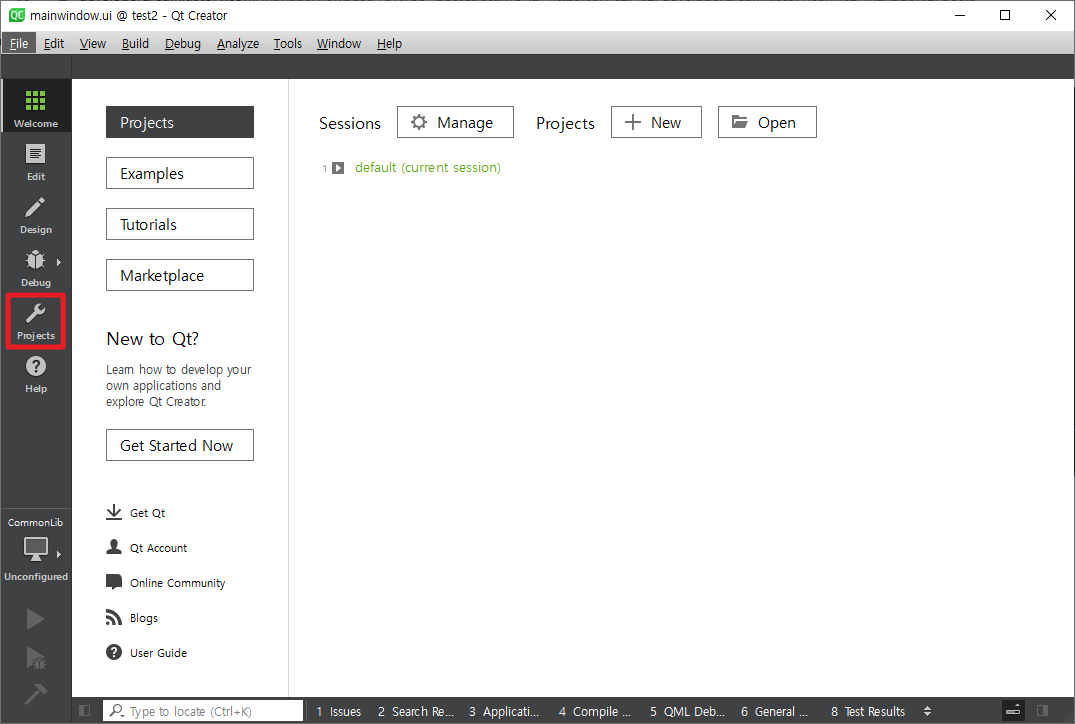 완료를 클릭하면 설치가 완료되며 다음과 같이 Qt Creator가 실행됩니다.