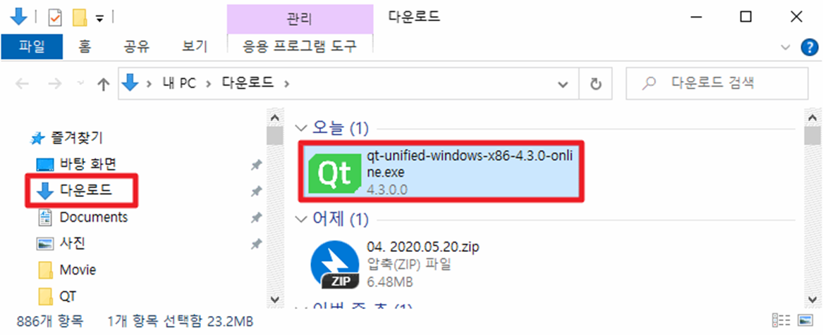 탐색기를 실행하여 다운로드를 클릭하면 다음과 같이 설치파일이 다운로드되어 있습니다.