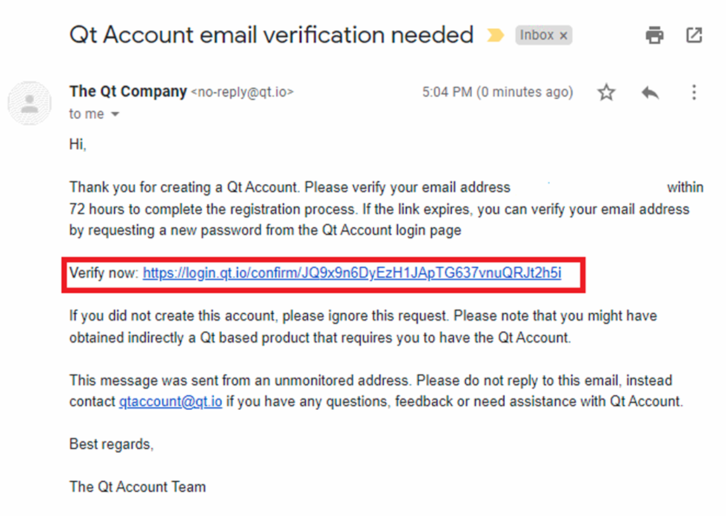 Email과 Password를 입력하고 나머지 정보를 입력한 후 Create Qt Account를 누르면 입력한 메일로 다음과 같이 확인 메일이 옵니다.