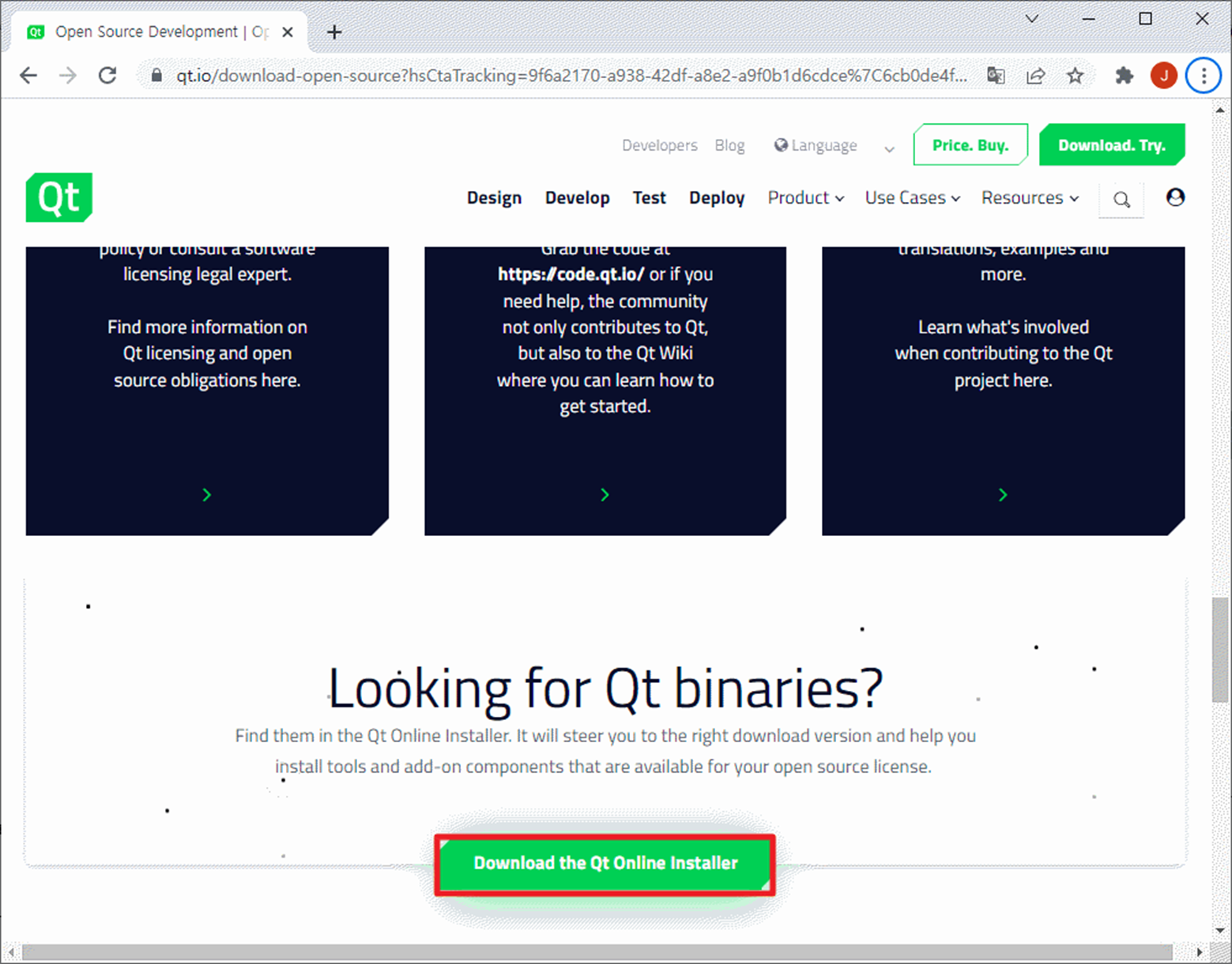 초기 화면(qt.io)에서 Download. Try.를 눌러 아래로 스크롤을 내리면 다음과 같이 화면에 나타납니다.