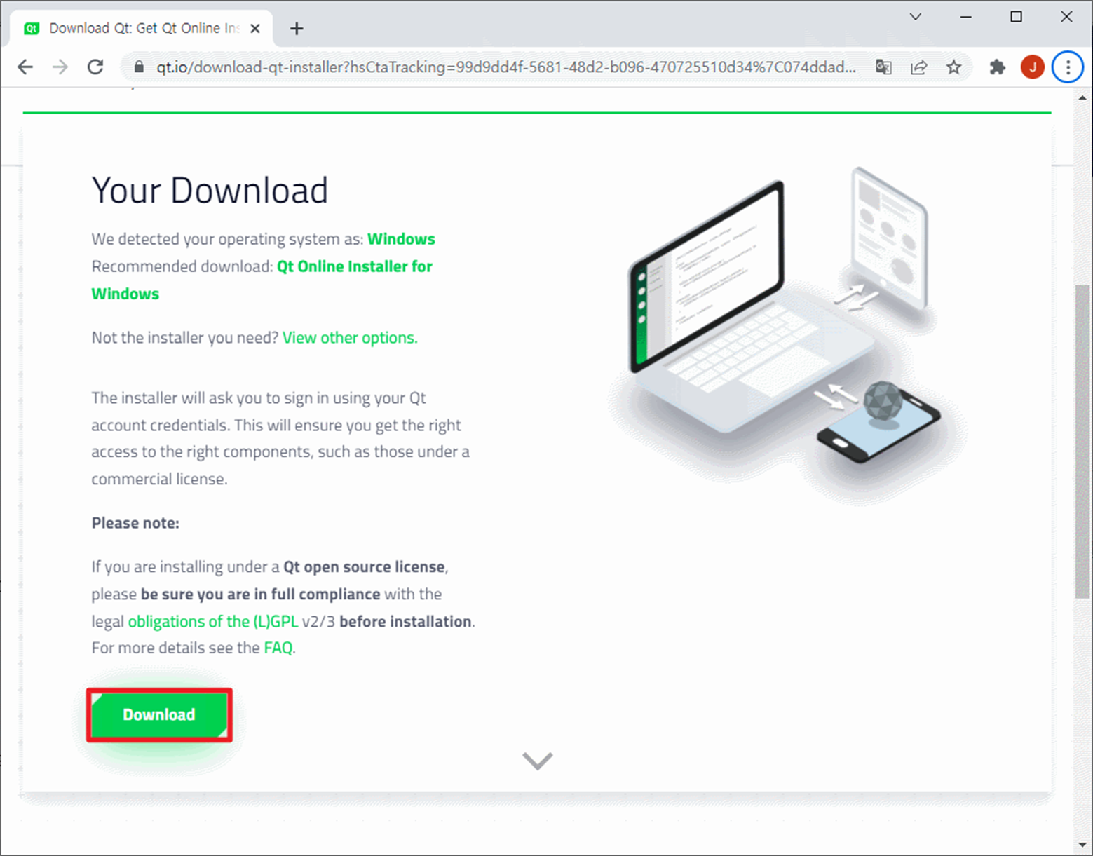Download the Qt Online Installer를 클릭하면 다음과 같이 화면이 나타납니다.