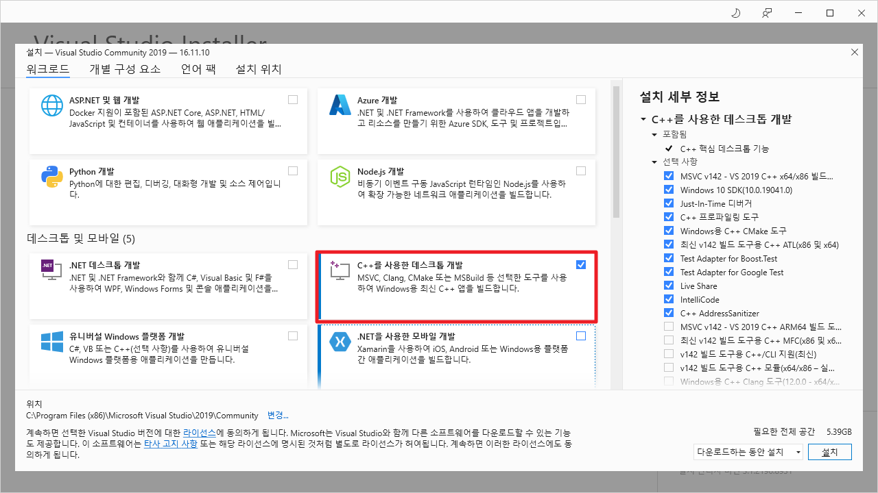 C++를 사용한 데스크톱 개발을 체크한 후 설치를 클릭하면 다음과 같이 화면에 나타나며 프로그램이 설치가 됩니다.