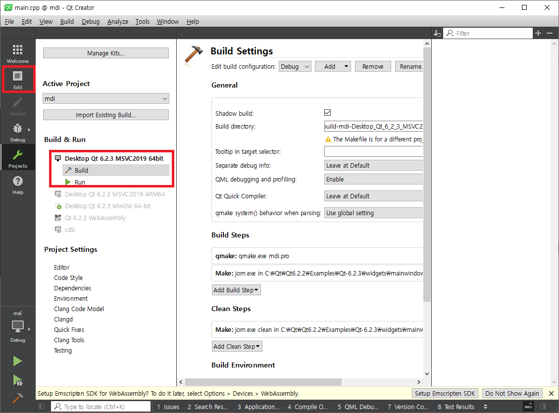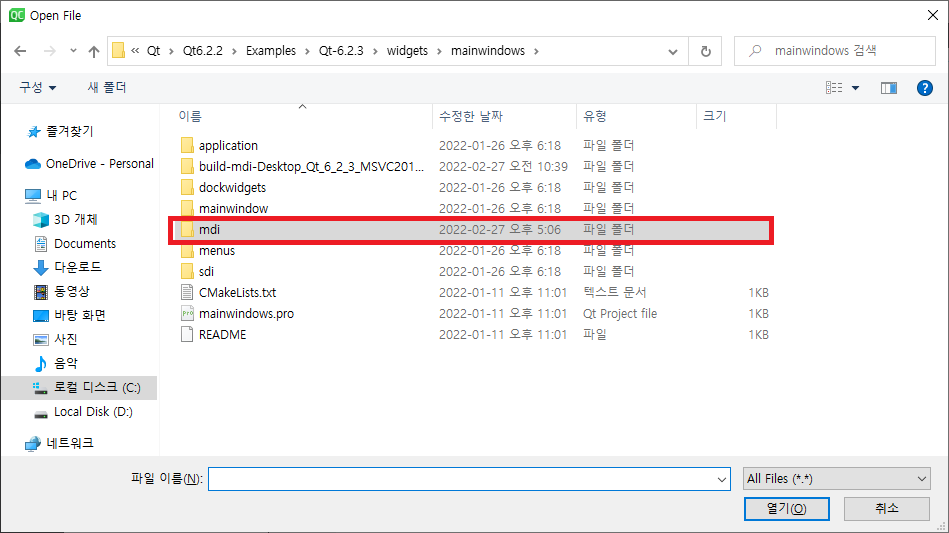 Build directory는 컴파일 결과물이 만들어 지는 폴더이며 C:\Qt\Qt6.2.2\Examples\Qt-6.2.3\widgets\mainwindows\build-mdi-Desktop_Qt_6_2_3_MSVC2019_64bit-Debug 예제가 있는 폴더에 mdi의 이름으로 지정이 되어 있는것을 알 수 있습니다.