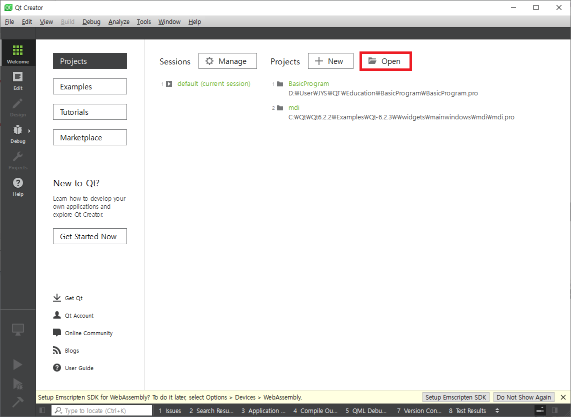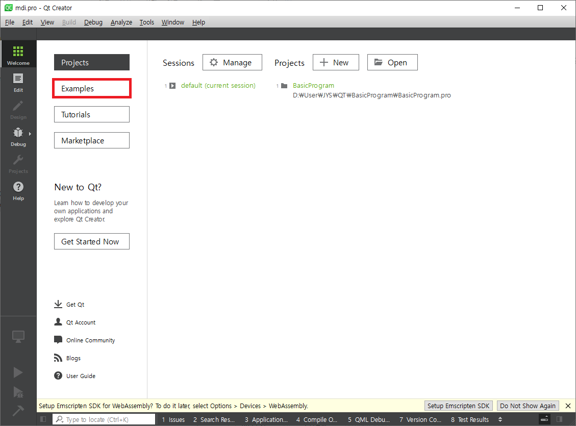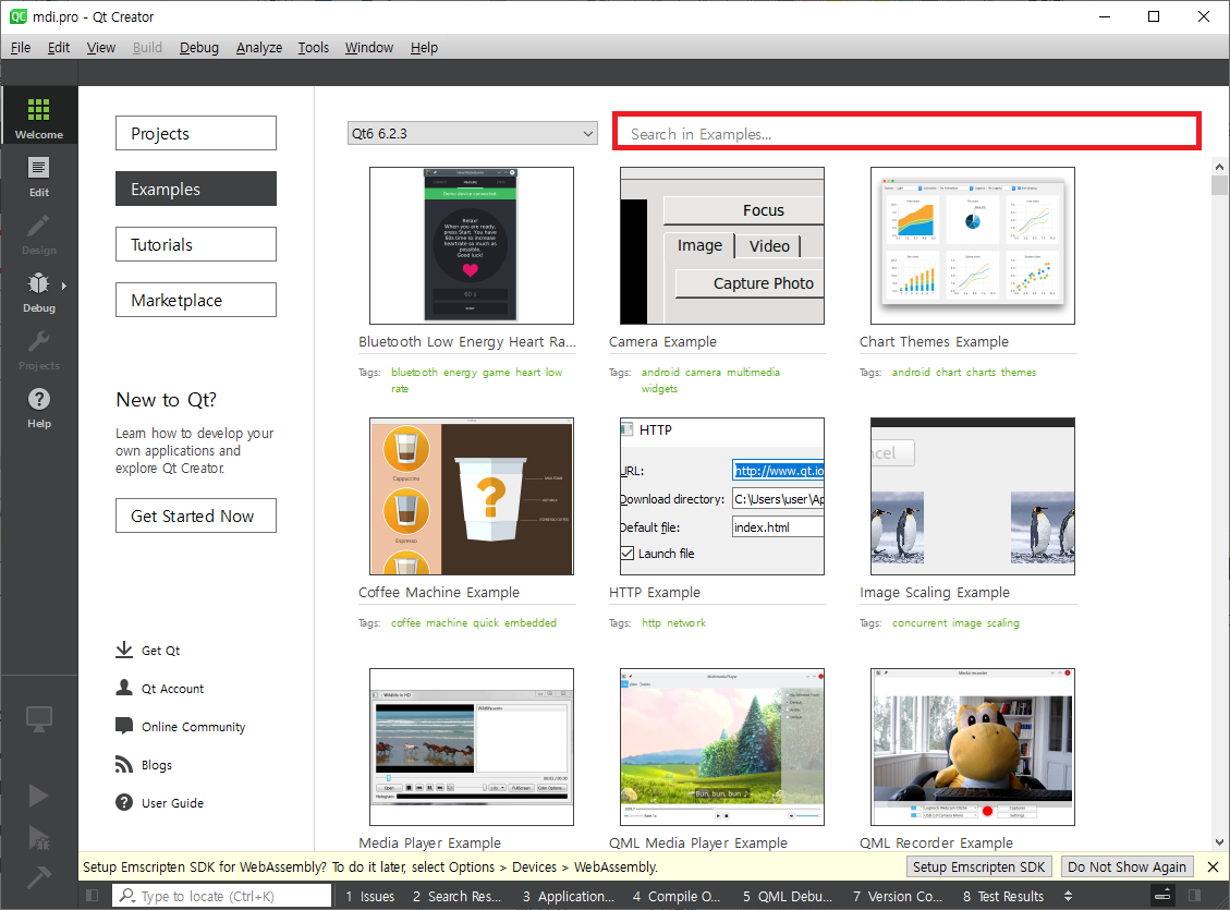 Qt Creator를 실행하여 Examples를 클릭하면 다음과 같이 화면이 바뀝니다.