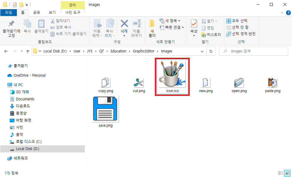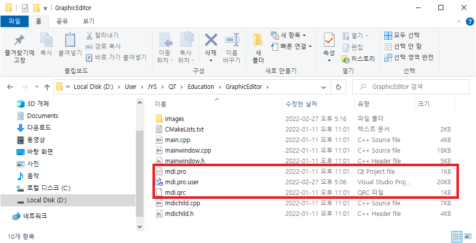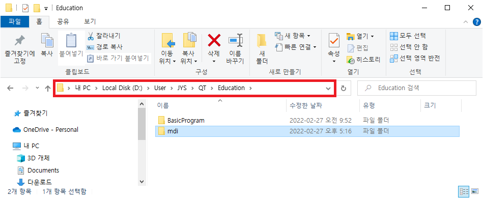 탐색기를 실행하여 QT 프로그램을 관리하는 폴더(여기서는 D:\User\JYS\QT\Education)에 Ctrl + 붙여 넣기를 하면 다음과같이 붙여넣기가 됩니다.