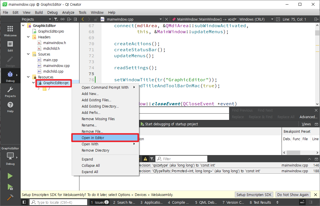 main.cpp를 더블클릭하여 열고 Q_INIT_RESOURCE(mdi)를 Q_INIT_RESOURCE(GraphicEditor)로 수정합니다.