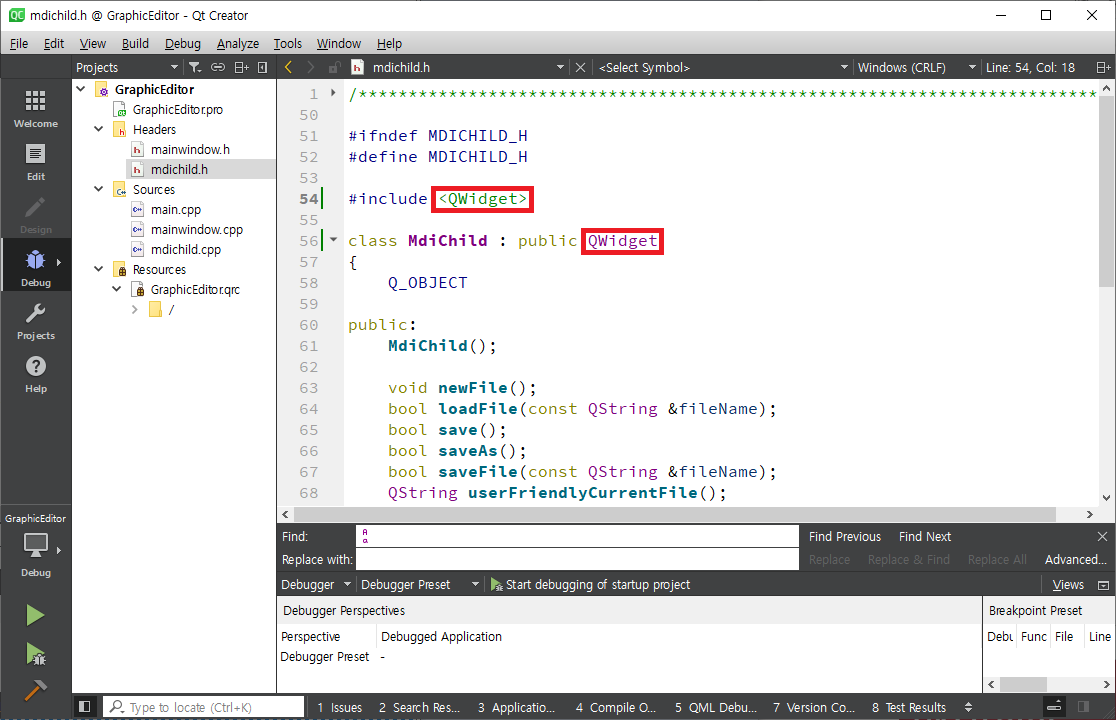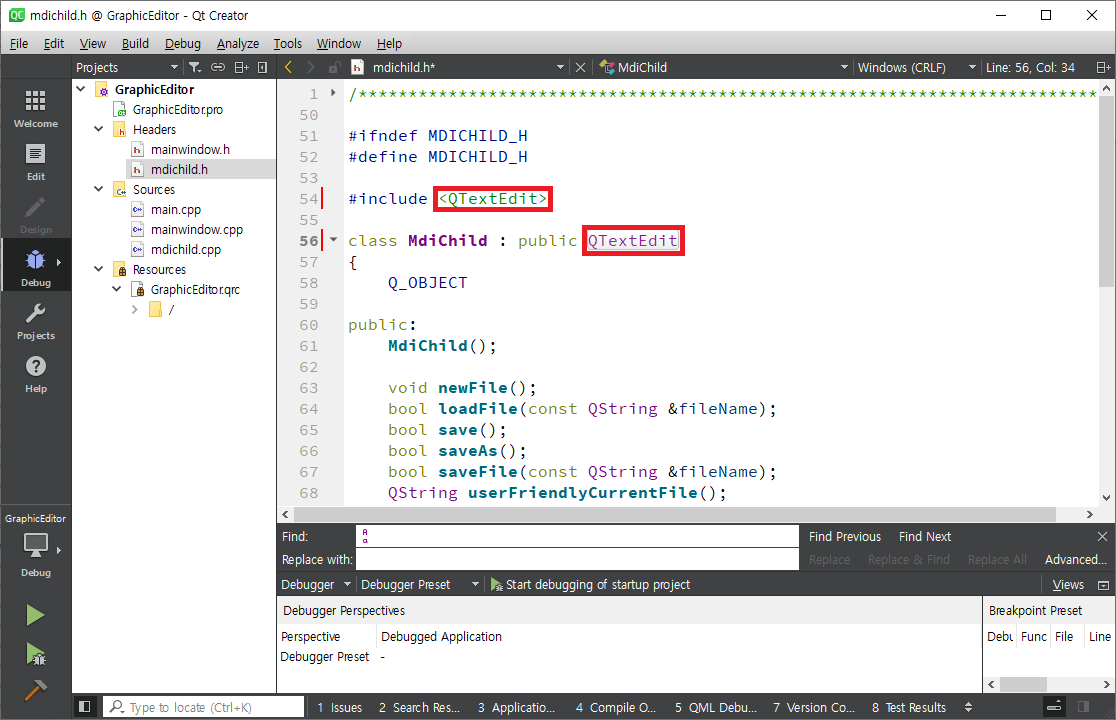 mdichild.h를 열어 보면 QTextEdit로 부터 상속 받아 사용하고 있는 것을 알수 있습니다.