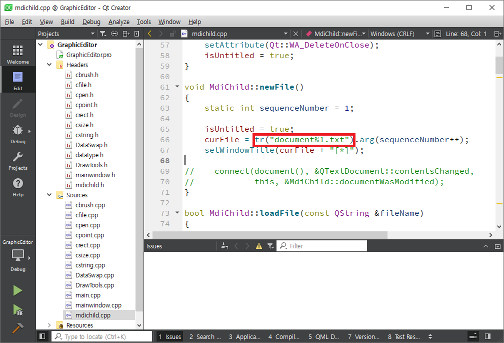 mdichild.cpp에서 newFile 함수를 찾아가보면 다음과 같이 화면에 나타납니다.