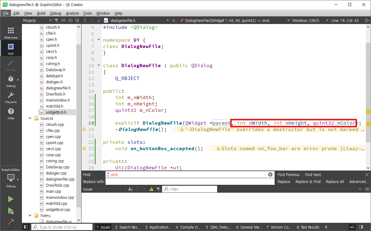 DialogNewFile 호출시 가로, 세로, 색상의 초기값을 설정할 수 있도록 생성자 함수에 세개의 변수를 넣어줍니다.