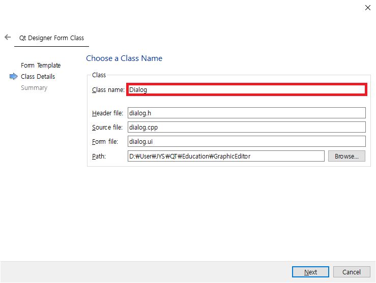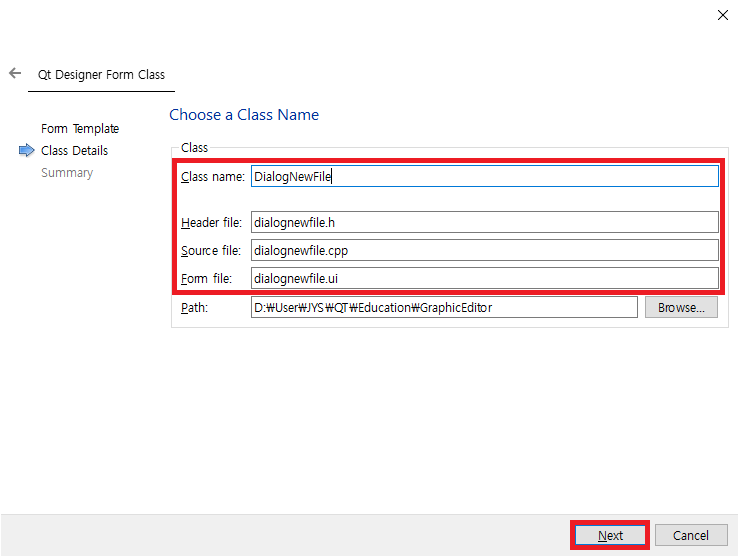 Class name의 Dialog를 DialogNewFile 로 수정하면 다음과 같이 화면이 변경됩니다.