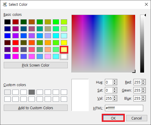 노란색을 선택하고 OK를 클릭하면 다음과 같이 대화상자가 변경됩니다.