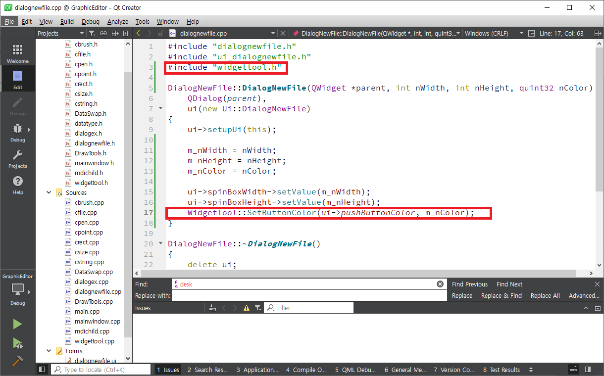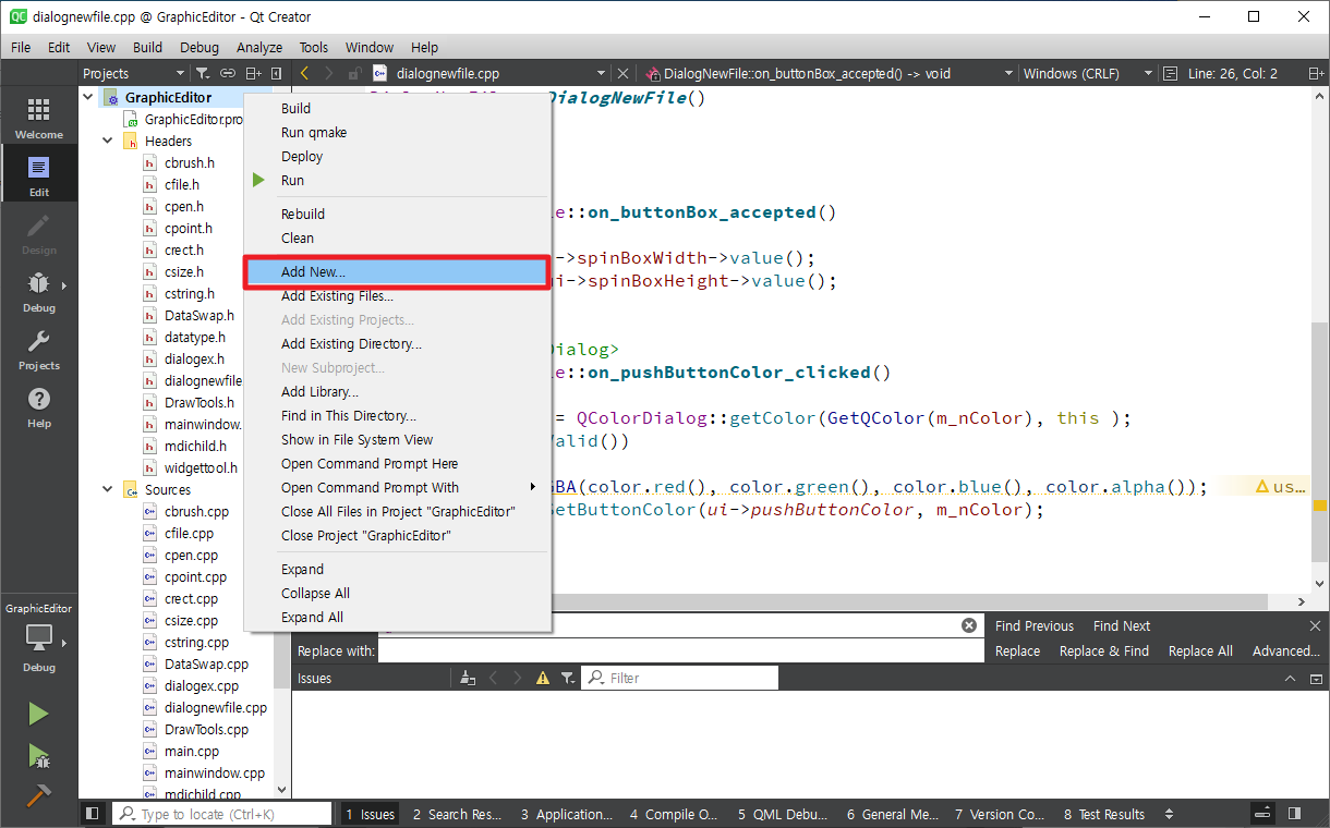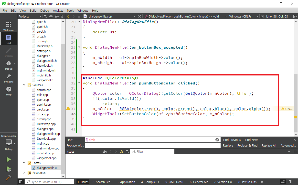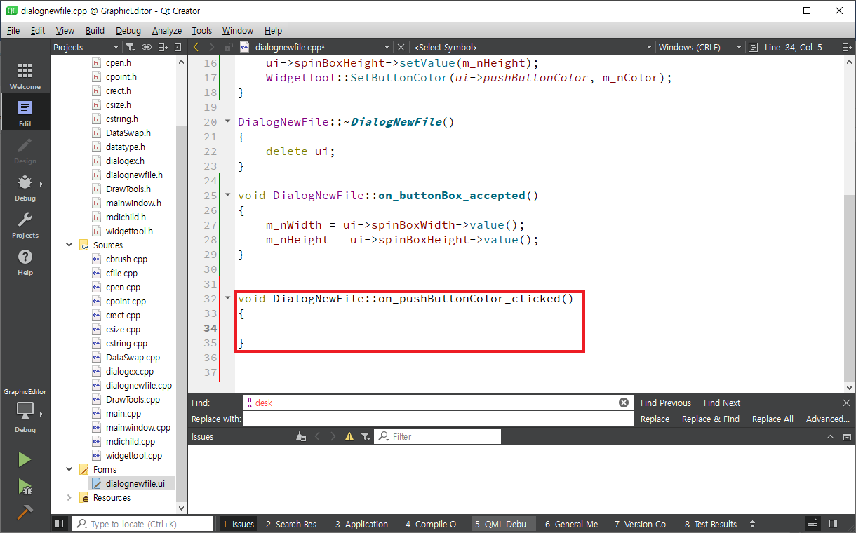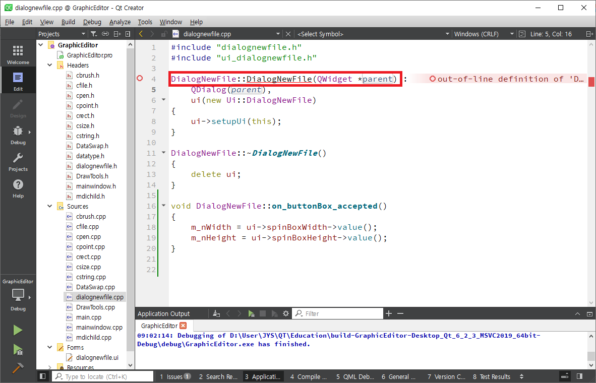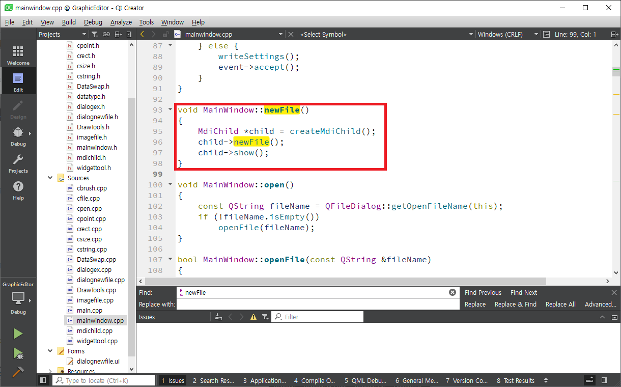 mainwindow.cpp 파일을 연다음 Ctrl + F를 눌러 newFile을 찾아 가면 다음과 같이 화면에 나타납니다.