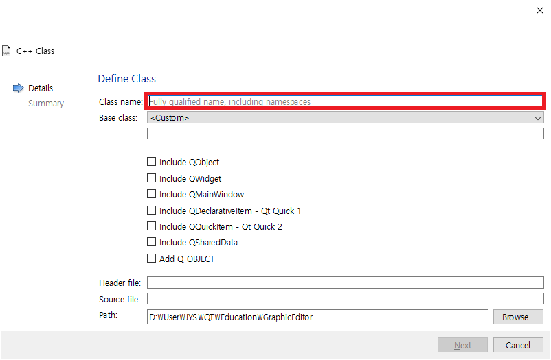 C++ Class를 선택하고, Choose를 클릭하면 다음과 같이 화면이 바뀝니다.