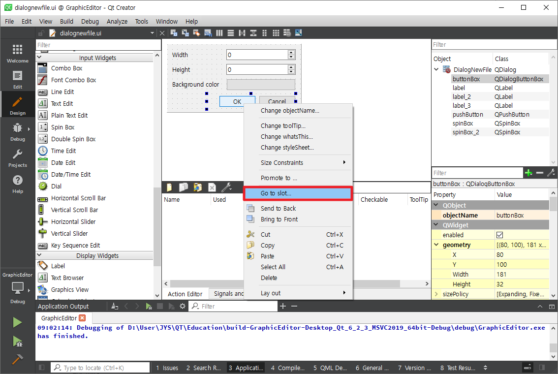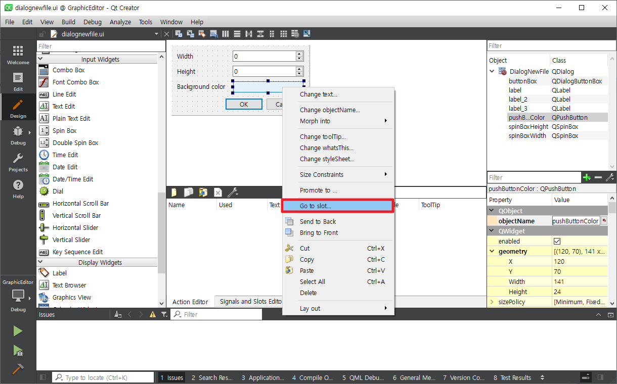 dialognewfile.ui를 열어 Background color Push Button에서 마우스 오른쪽 버튼을 누르면 다음과 같이 팝업메뉴가 화면에 나타납니다.