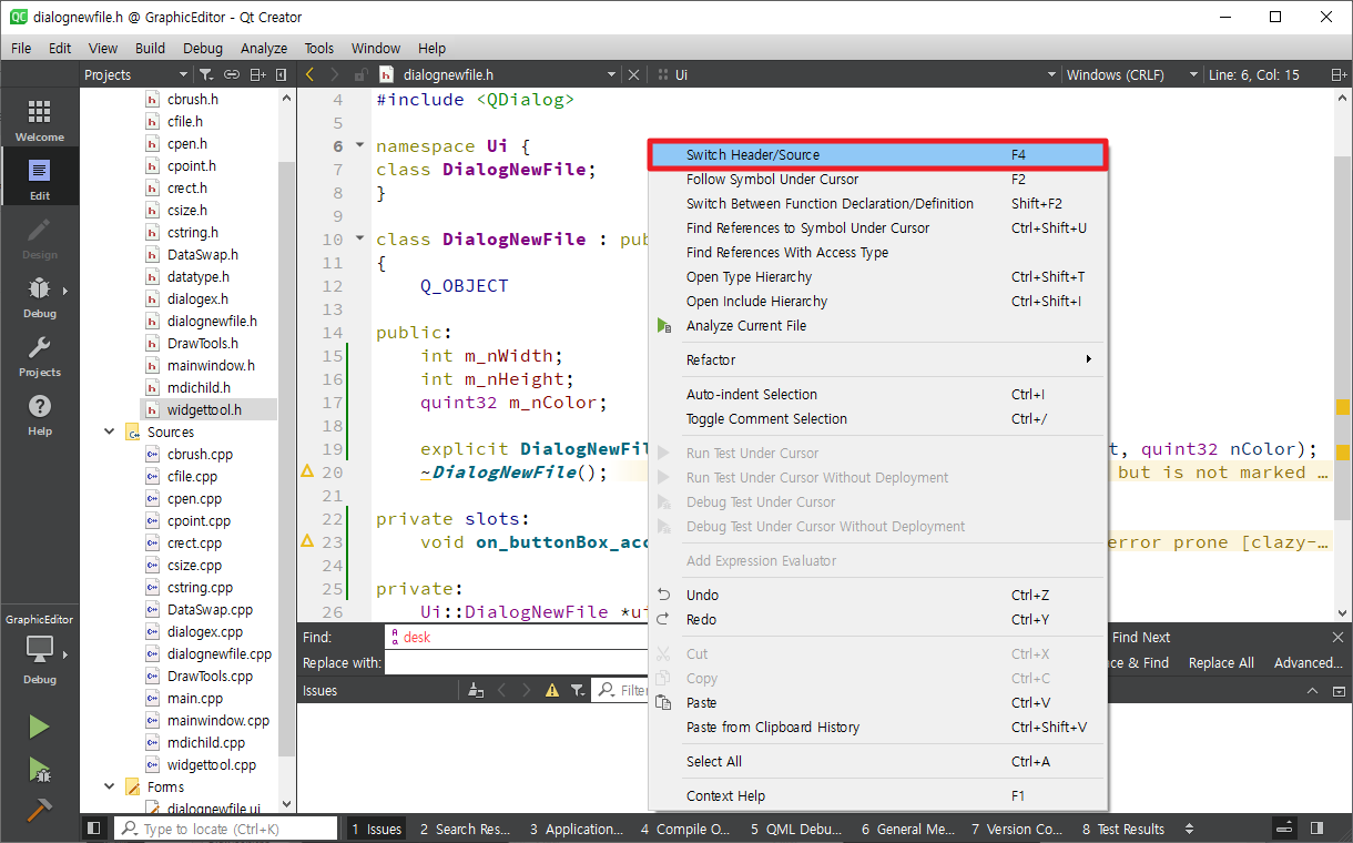 Switch Header/Source를 실행하면 다음과 같이 같은 이름의 .h 파일이 화면에 나타납니다.