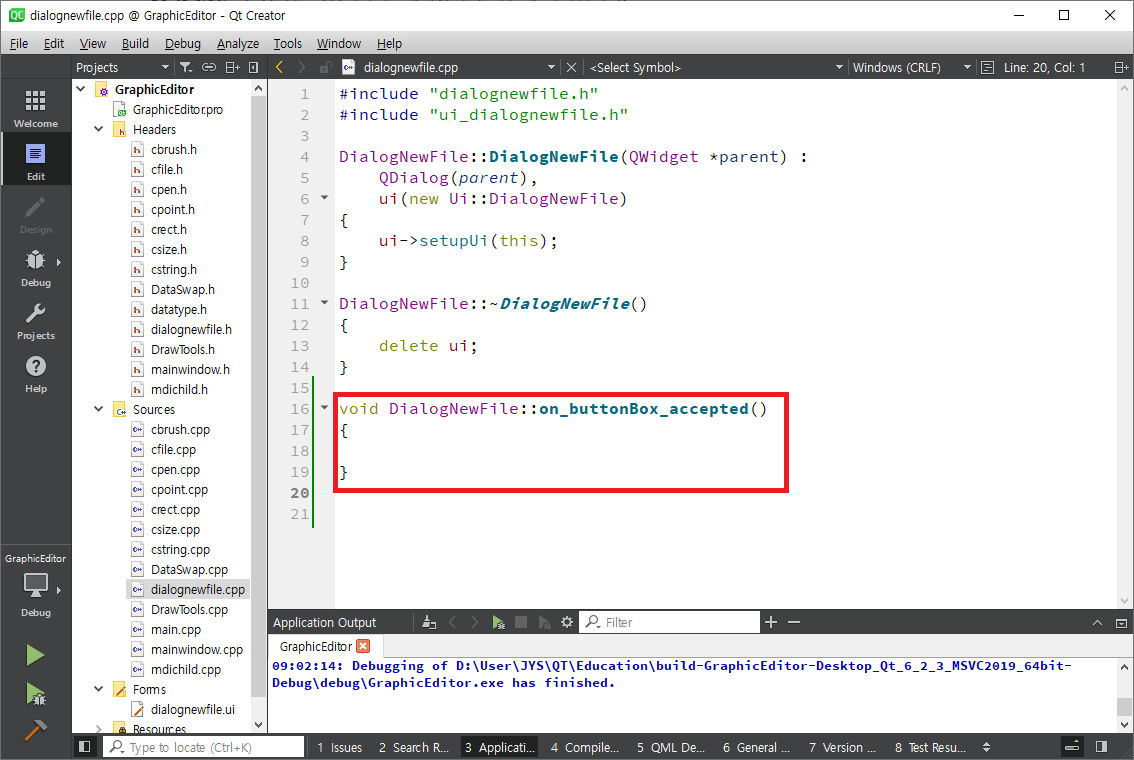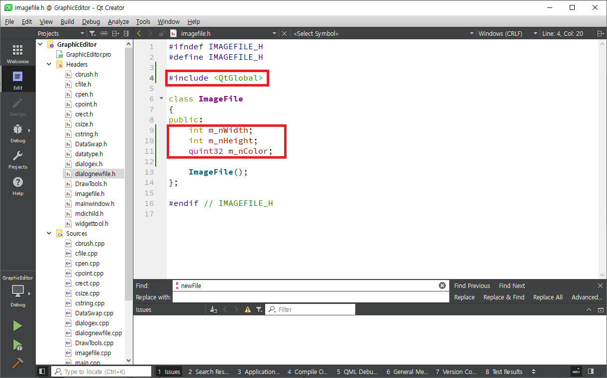 Finish를 클릭하면 다음과 같이 imagefile.cpp와 imagefile.h가 추가됩니다.