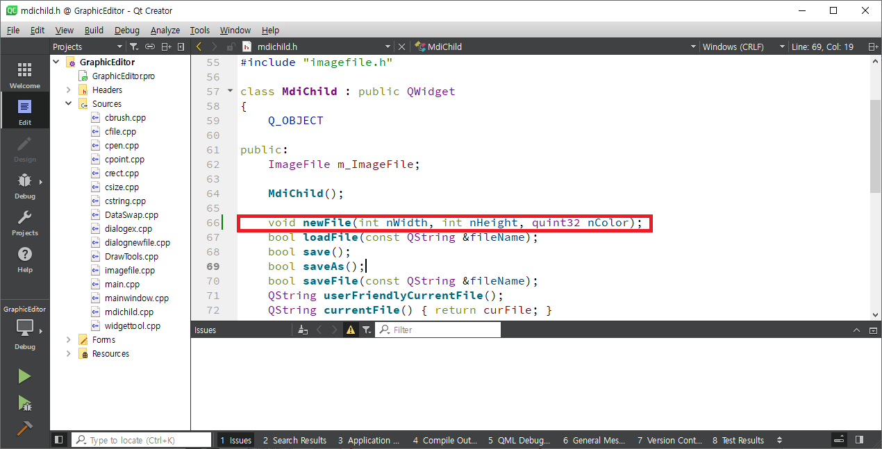mdichild.h 파일을 열어 다음과 같이 ImageFile로 변수를 선언합니다.