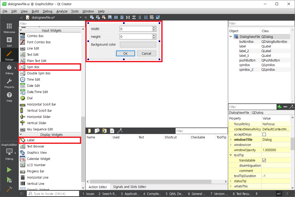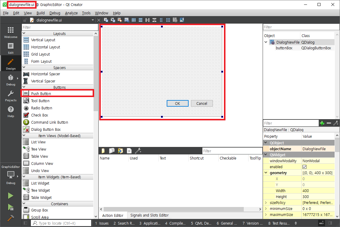 Finish를 클릭하면 다음과 같이 프로젝트에 추가되고 dialognewfile.ui가 디자인 모드로 표시됩니다.
