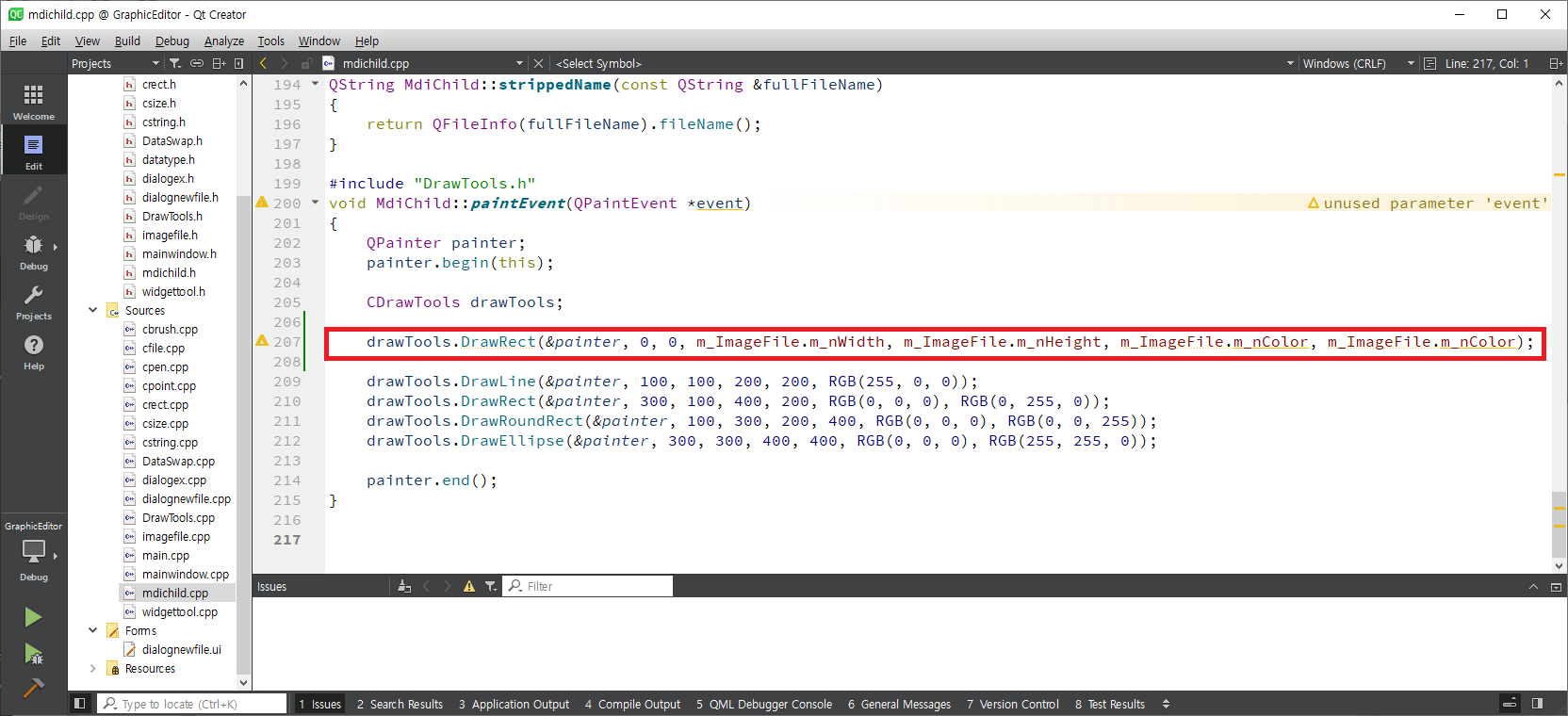 mdichild.cpp를 열어 제일 마지막 줄로 이동하면 다음과 같이 paintEvent함수가 나타납니다.