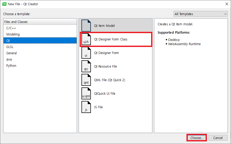 Qt Designer Form Class를 선택하고 Choose를 클릭하면 다음과 같이 화면에 나타납니다.