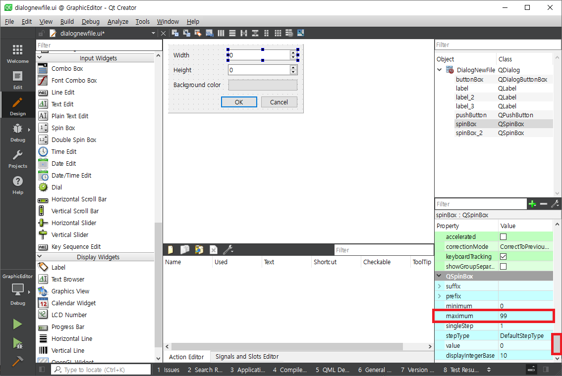 Height Spin Box를 클릭하여 objectName을 spinBoxHeight로 수정하고 같은 방식으로 maximum을 10000으로 수정합니다.