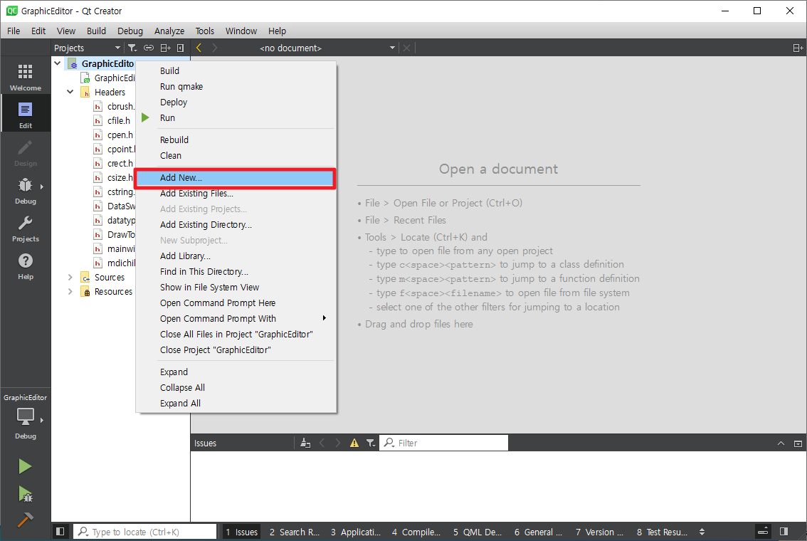 프로젝트 이름에서 마우스 오른쪽 버튼을 누르면 다음과 같이 팝업 메뉴가 나타납니다.