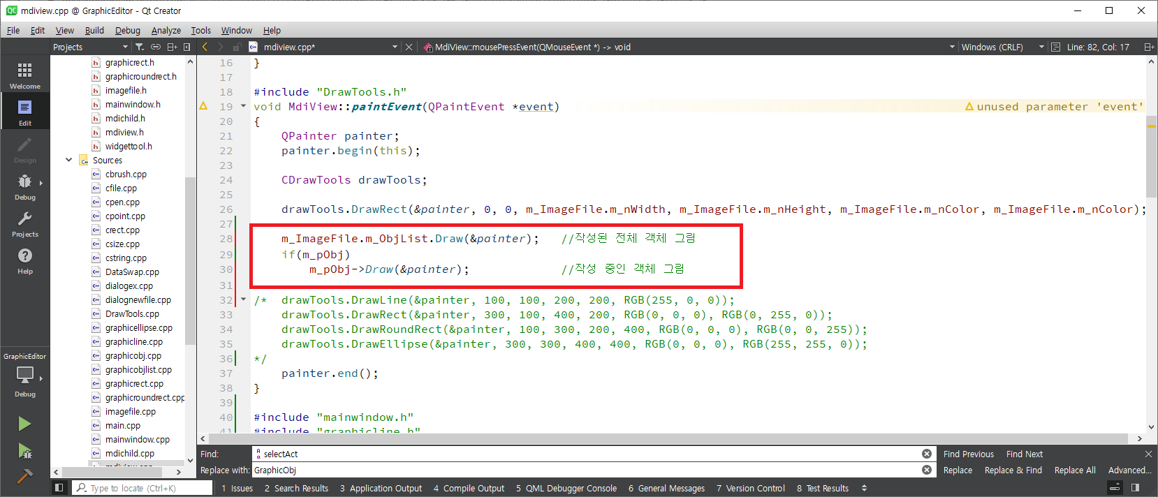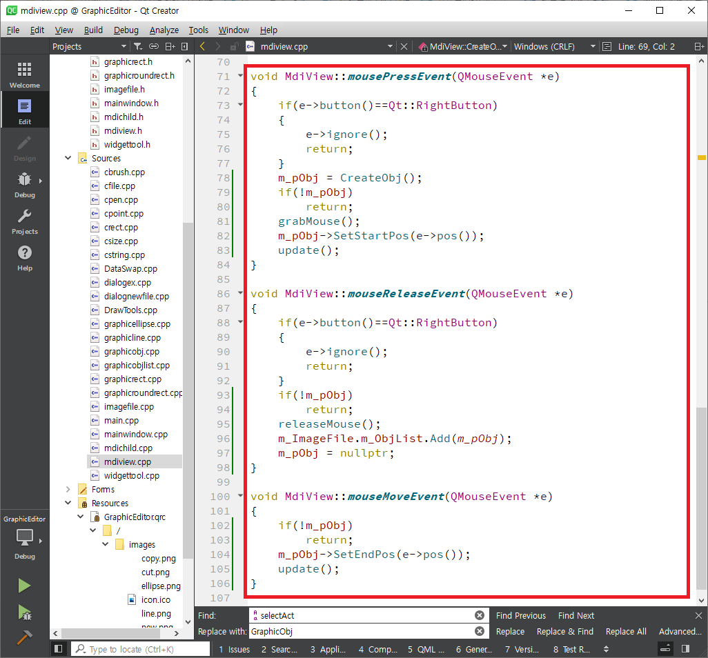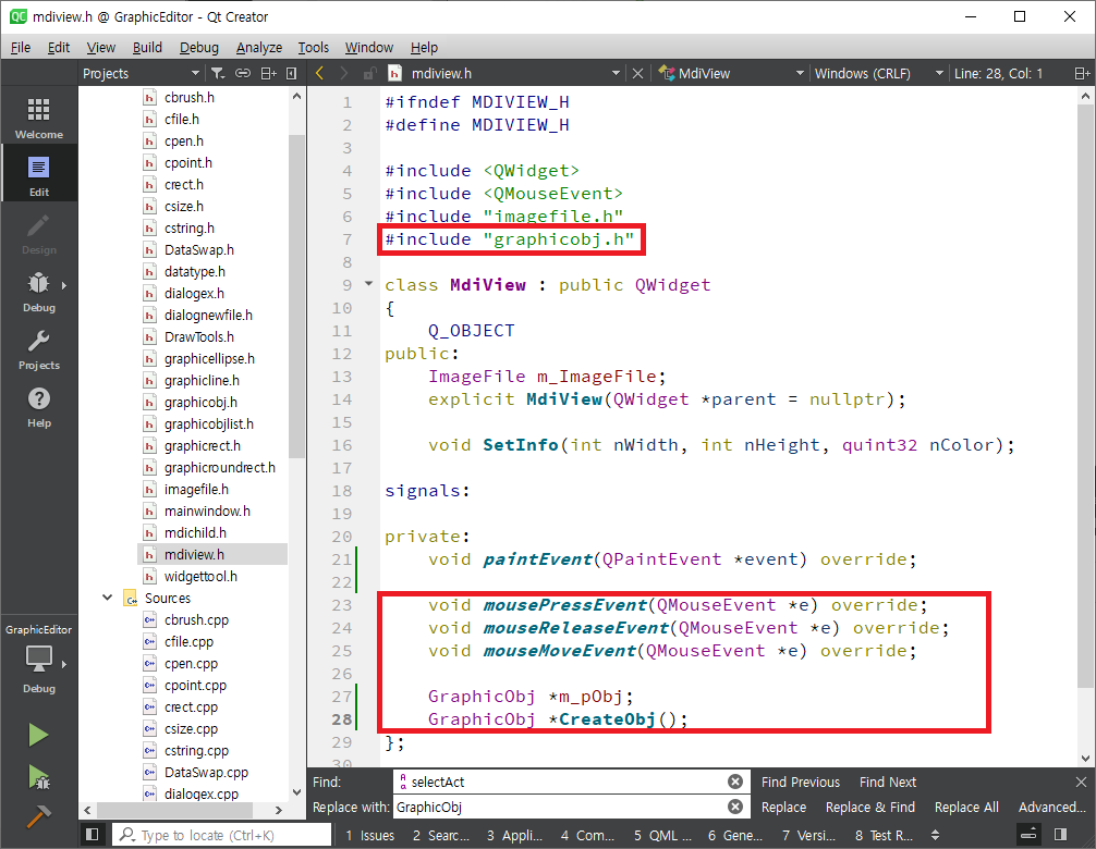 mdiview.h를 열어 mouse이벤트를 실행하는 세개의 함수를 정의하고 그리는 중인 객체의 정보를 가지는 변수인 m_pObj를 선언합니다.