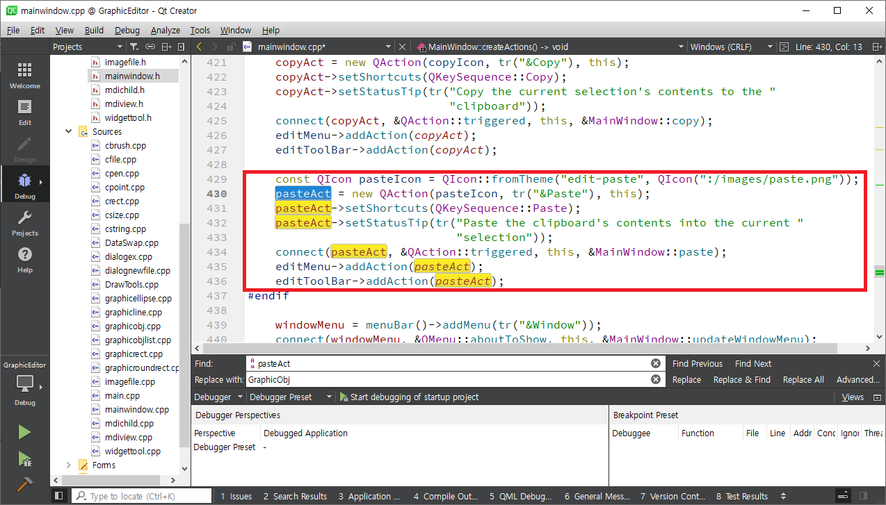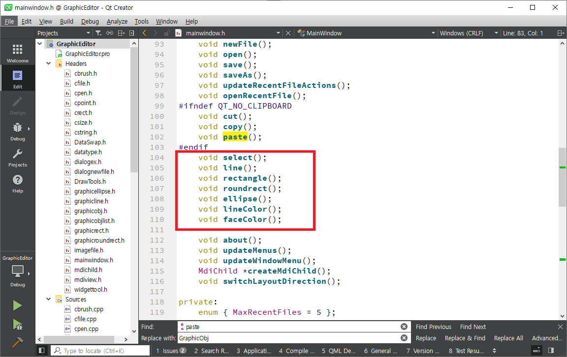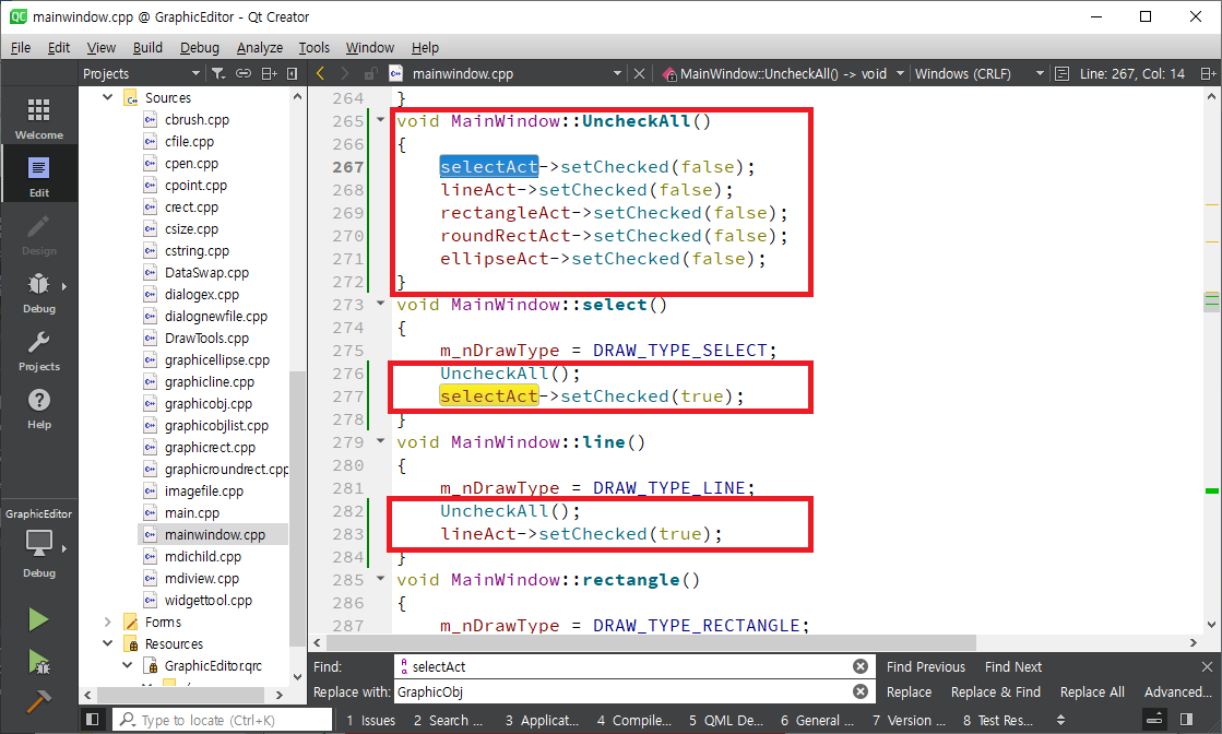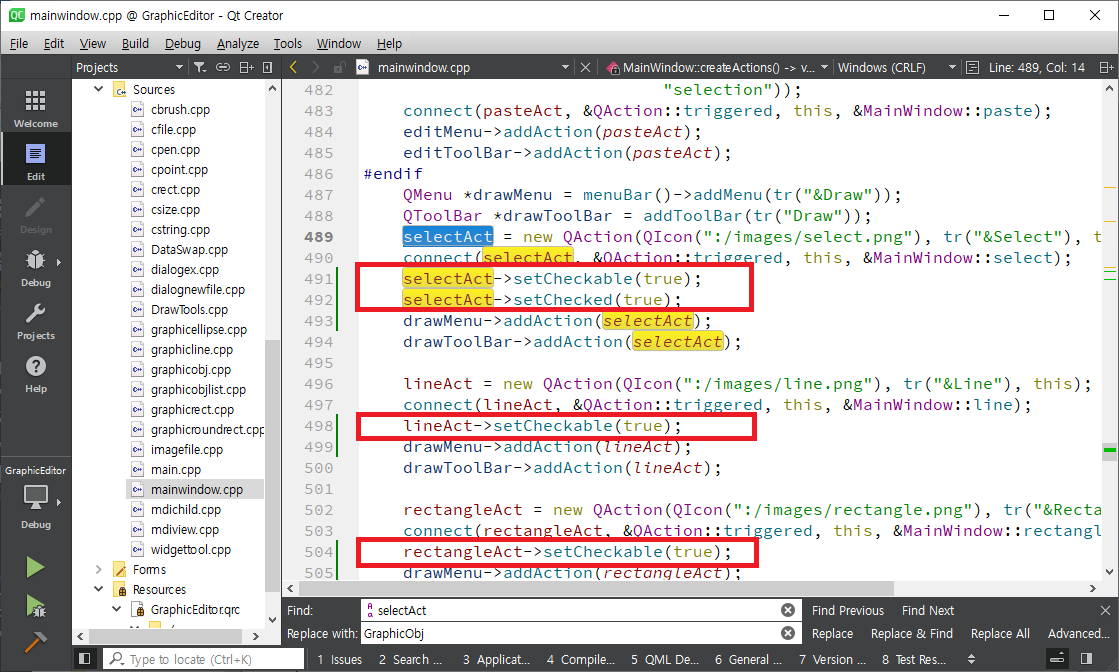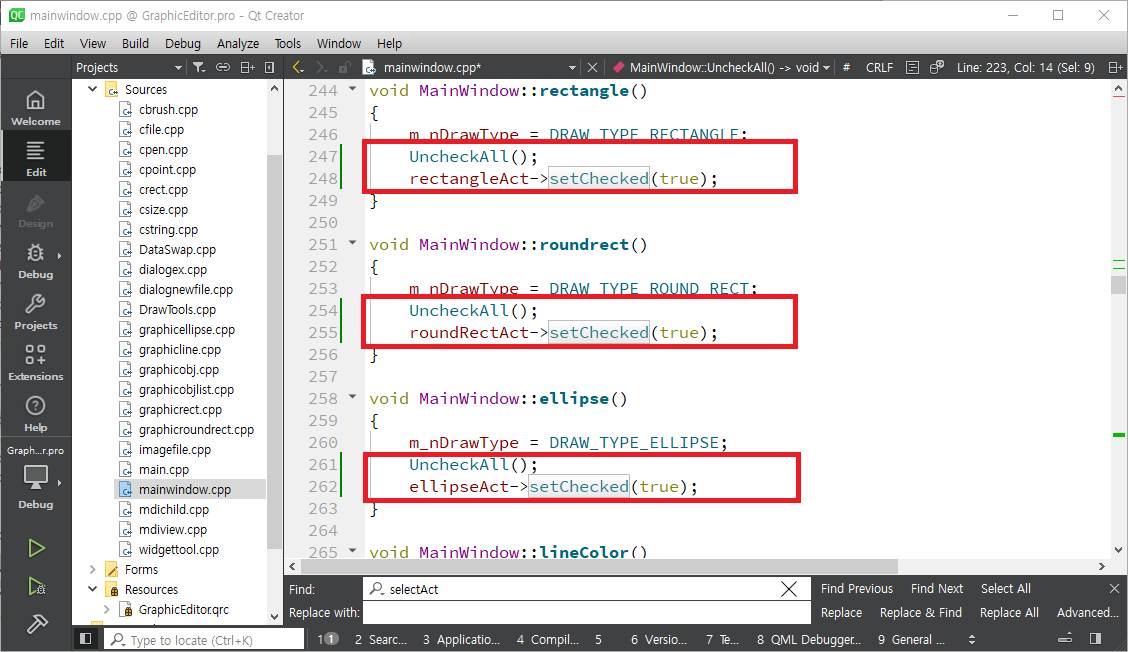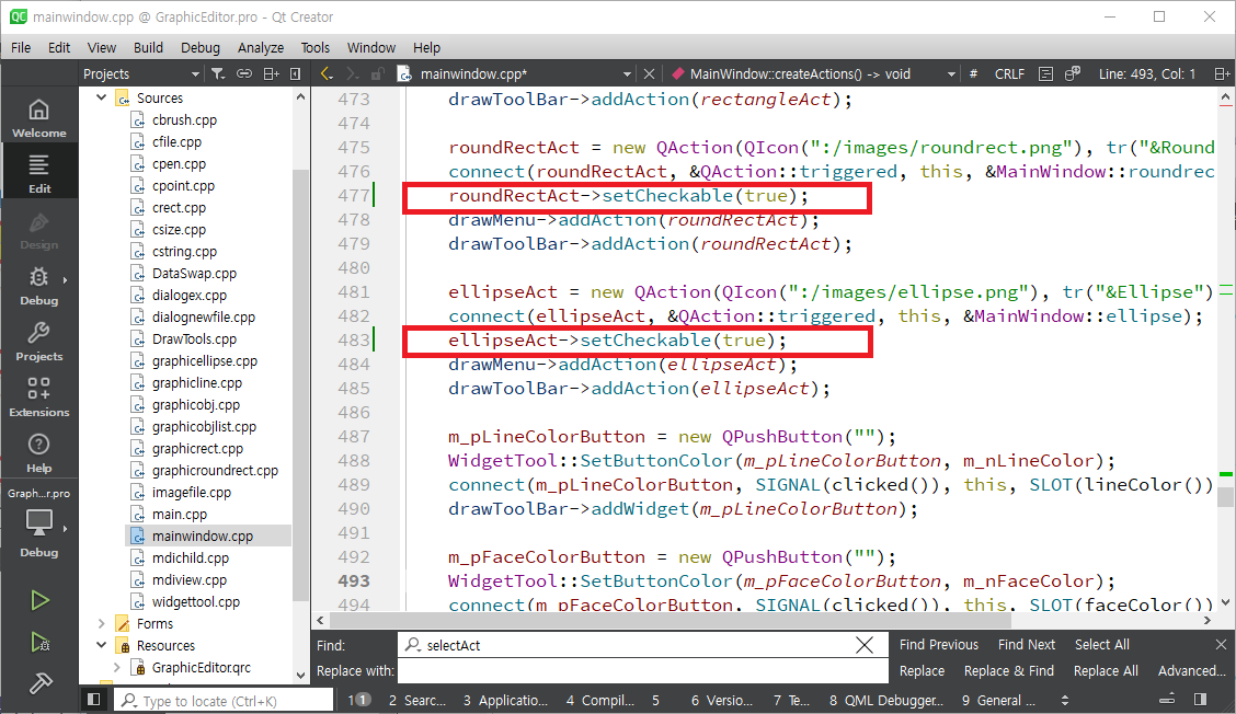mainwindow.cpp를 열어 selectAct를 찾아 메뉴 생성하는 부분으로 간 후 setCheckable함수를 이용하여 체크(선택된 모양으로 표시)가 가능하도록 합니다. 같은 방식으로 lineAct, rectangleAct, roundRectAct, ellipseAct에 setCheckable(true)를 호출합니다. selectAct는 setChecked함수를 이용하여 초기에 체크되도록 합니다.