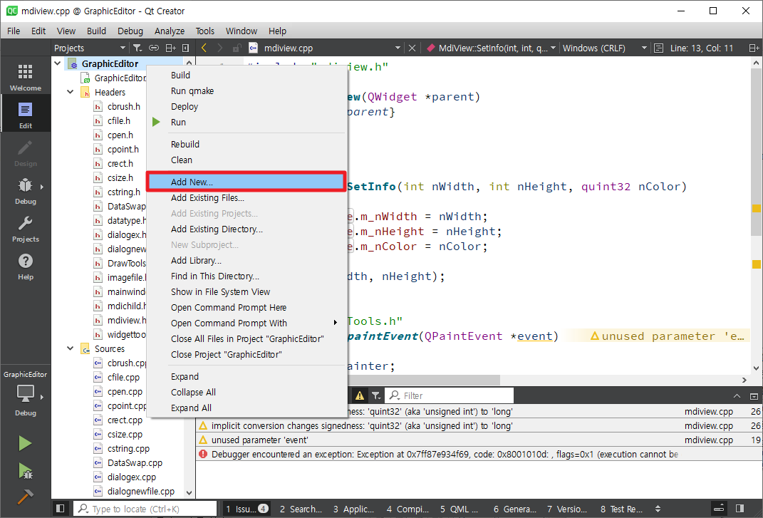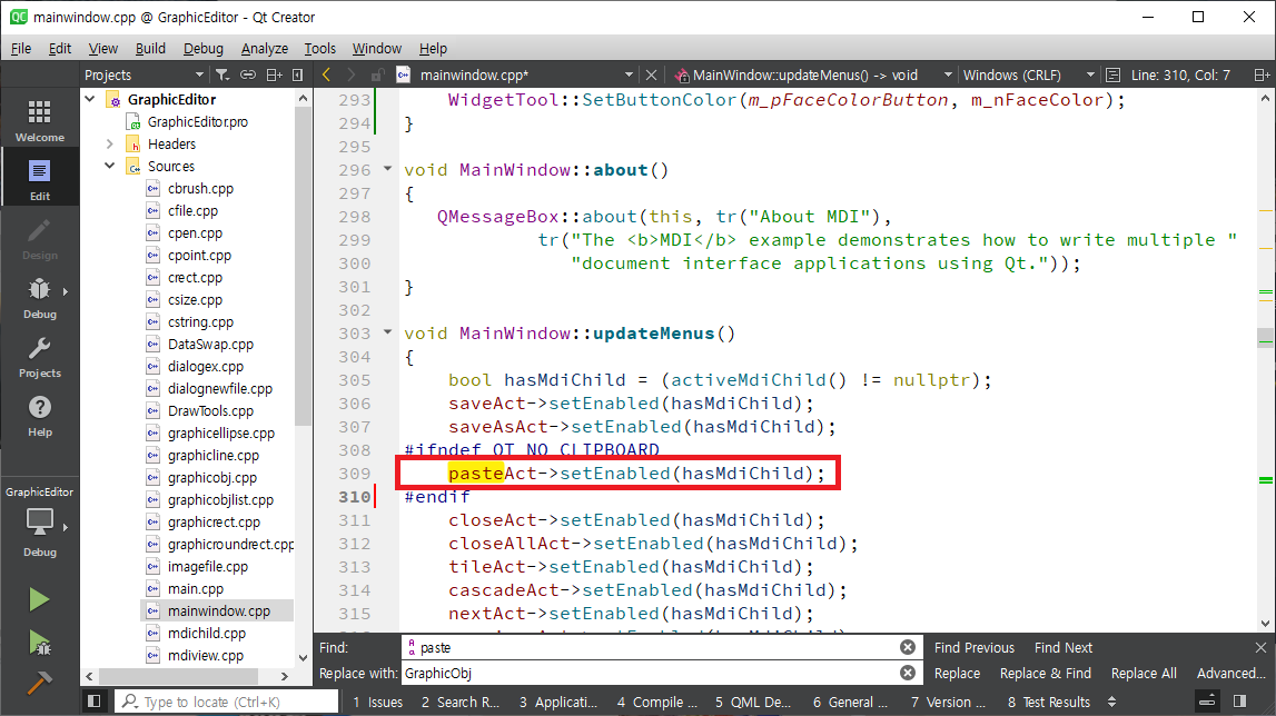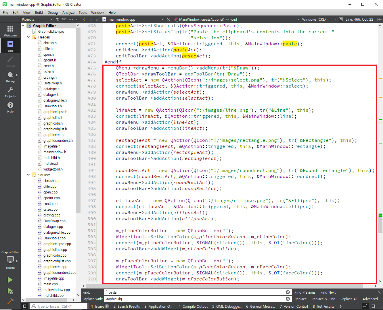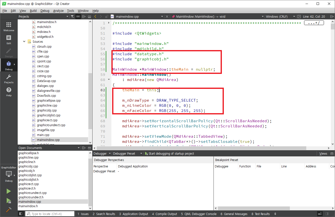 mainwindow.cpp를 열어 selectAct를 찾아 메뉴 생성하는 부분으로 간 후 setCheckable함수를 이용하여 체크(선택된 모양으로 표시)가 가능하도록 합니다. 같은 방식으로 lineAct, rectangleAct, roundRectAct, ellipseAct에 setCheckable(true)를 호출합니다. selectAct는 setChecked함수를 이용하여 초기에 체크되도록 합니다.