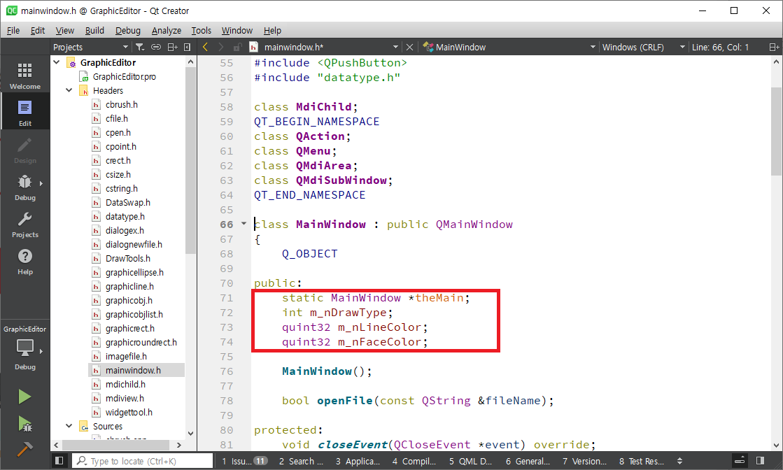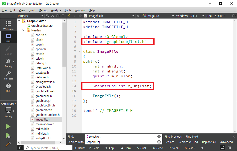 imagefile.h를 열어 GraphicObjList Class로 변수를 하나 정의합니다.