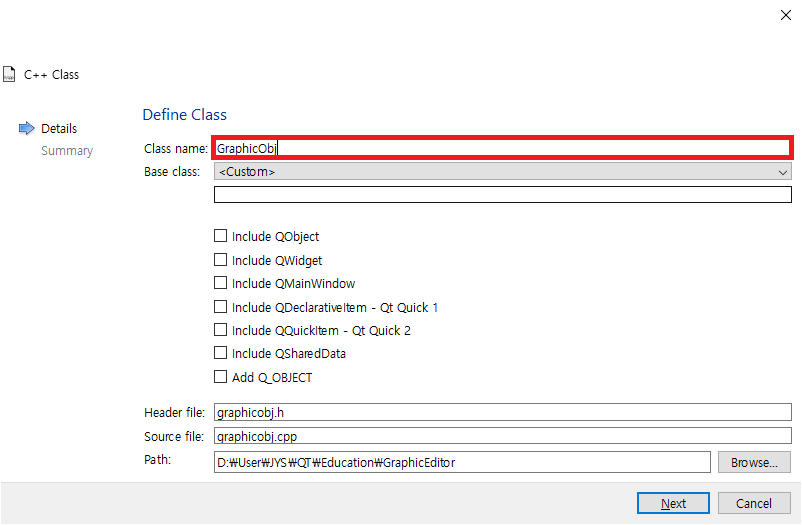C++ Class를 선택하고 Choose를 클릭하여 나타난 화면에서 Class name에서 GraphicObj를 입력하면 다음과 같이 화면에 나타납니다.