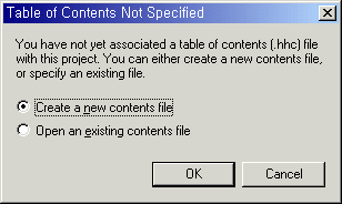 Contents 탭을 선택하면 다음과 같은 대화 상자가 생성되어 <그림 3>에서 생성하지 않은 HTML Help table of contents를 생성할 것인지를 묻습니다.