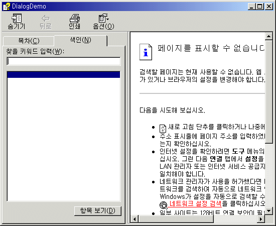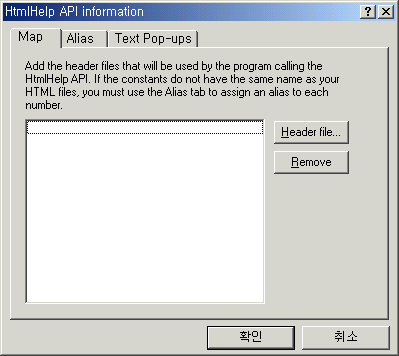 2. 대화 상자에 도움말 버튼을 두어 그 버튼을 누르거나 대화 상자가 뜬 상황에서 F1키를 누르면 해당 대화 상자의 도움말이 화면에 나타납니다. 이 기능을 수행하기 위해서는 도움말을 조금 수정해야 하고 대화 상자 ID와 HTML 파일을 연결해야만 합니다.