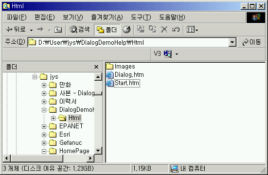우선 도움말을 만들고자 하는 아래 그림과 같이 디렉토리(여기서는 DeditorDemoHelp)를 생성하여 그 디렉토리에 Html이라는 디렉토리를 만들고 Html파일을 만들어 저장(여기에서 데모로 Start.htm, Dialog.htm 파일 제작)합니다. 그리고 Html 디렉토리 아래에 Images라는 디렉토리를 만들어 Html파일에서 사용하는 그림들을 넣습니다.