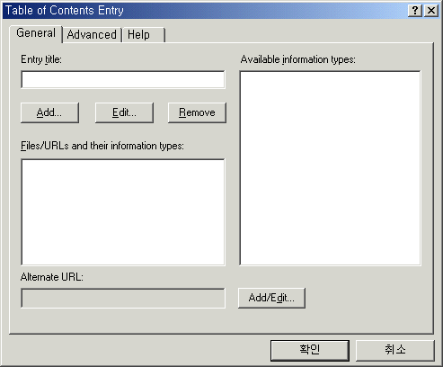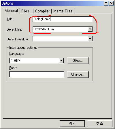 Title에 도움말을 실행했을 때 나타나는 화면의 Title을 입력하고, Default file에 도움말 실행시 첫화면에 나타날 화면이름을 입력합니다(선택 버튼이 없어 수동으로 입력해야 합니다).