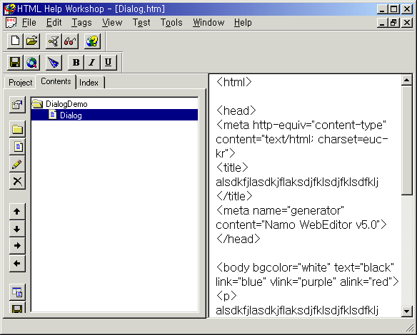 앞에서 작성한 도움말 프로젝트 파일(.hhp)을 열면 다음과 같이 화면에 나타납니다.
