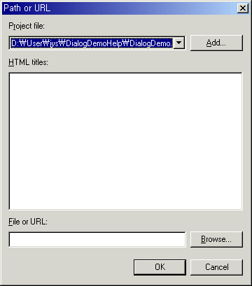두번째 Editor : 도움말 프로젝트 파일이 있는 디렉토리를 기준으로 상대 위치와 파일명을 입력합니다. 만약 프로젝트 디렉토리에 html이라는 디렉토리를 만들고 그 디렉토리에 dialog.htm 파일을 작성하여 ID와 연결하고자 한다면 html\dialog.htm이라고 입력합니다.