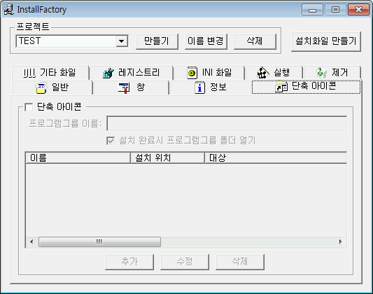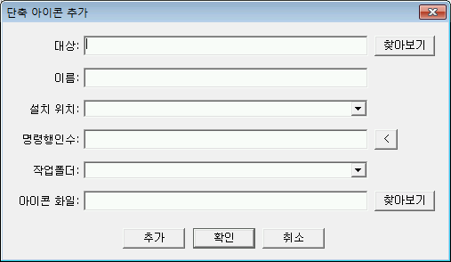 대상 : 소스폴더내의 단축아이콘으로 등록할 실행파일을 선택합니다.