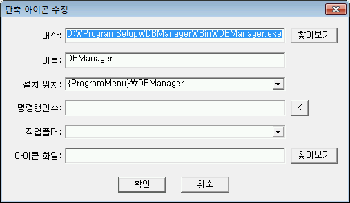다음 화면은 시작 메뉴에 DBManager 폴더를 만들어({ProgramMenu}\DBManager) 단축아이콘을 만들도록 설정한 화면입니다.