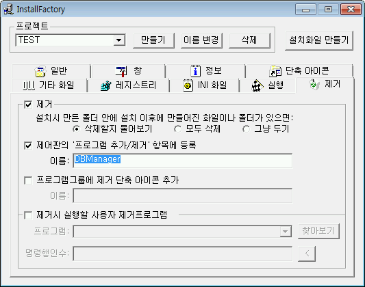 제거 체크버튼을 체크하고 제어판의 '프로그램 추가/제거' 항목에 등록을 체크한 후 이름을 입력합니다.