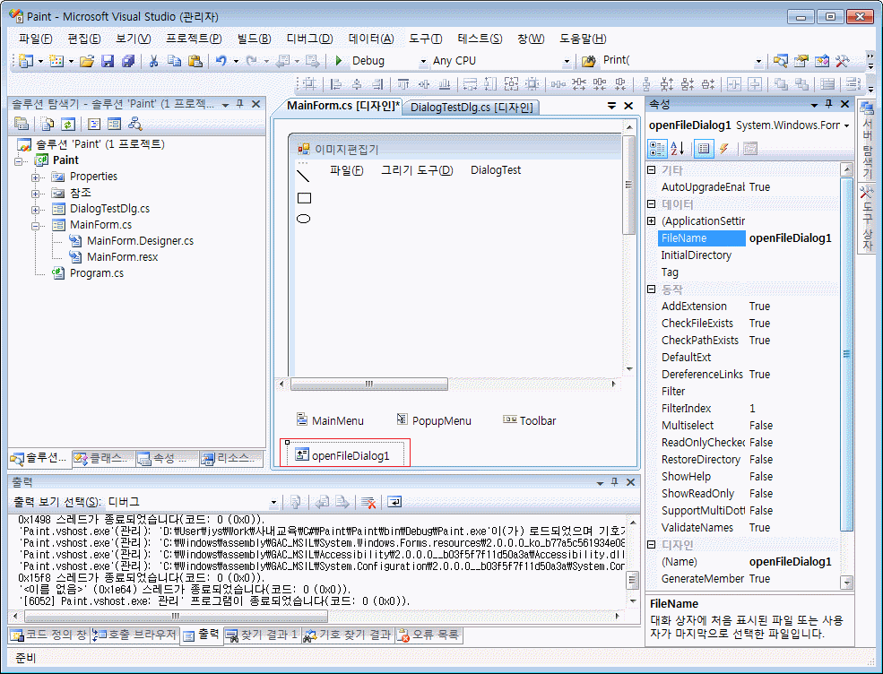 여기서도 모든 대화 상자를 설명하는 것이 아니라 OpenFileDialog를 이용하여 개념만을 설명하도록 하겠습니다.