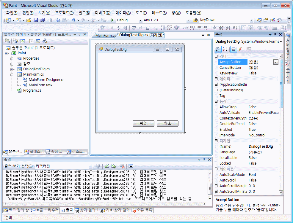 대화 상자에서 Enter키를 누르면 확인 버튼을 누른것과 같이 동작하도록 하고, Esc키를 누르면 취소 버튼을 누른것과 같은 동작을 하도록하기 위해서 Form(대화 상자) 속성에 AcceptButton과 CancelButton이 존재합니다.