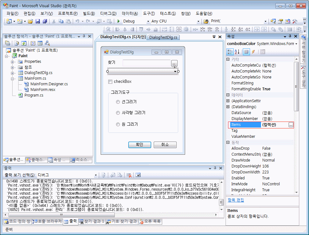 이제 대화 상자를 지원해보겠습니다. 프로그램은 메뉴 및 툴바에서 작성한 프로젝트(Paint)를 이용하겠습니다.