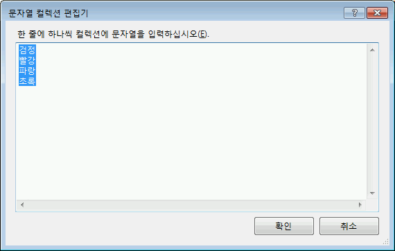 여기에 필요한 항목을 세로로 하나씩 입력하고 확인을 선택하면 실행시 ComboBox에 항목이 올라오게 됩니다.